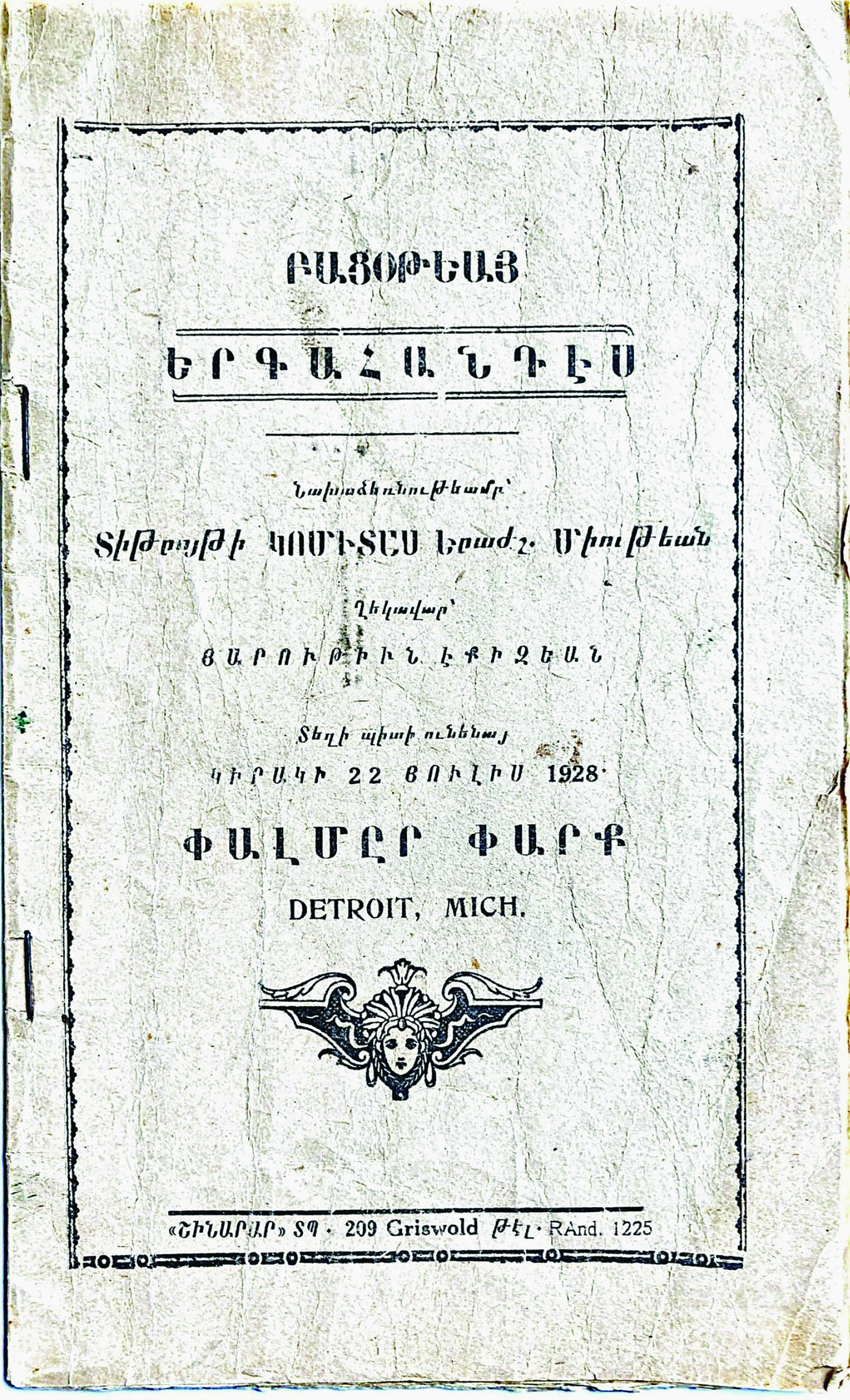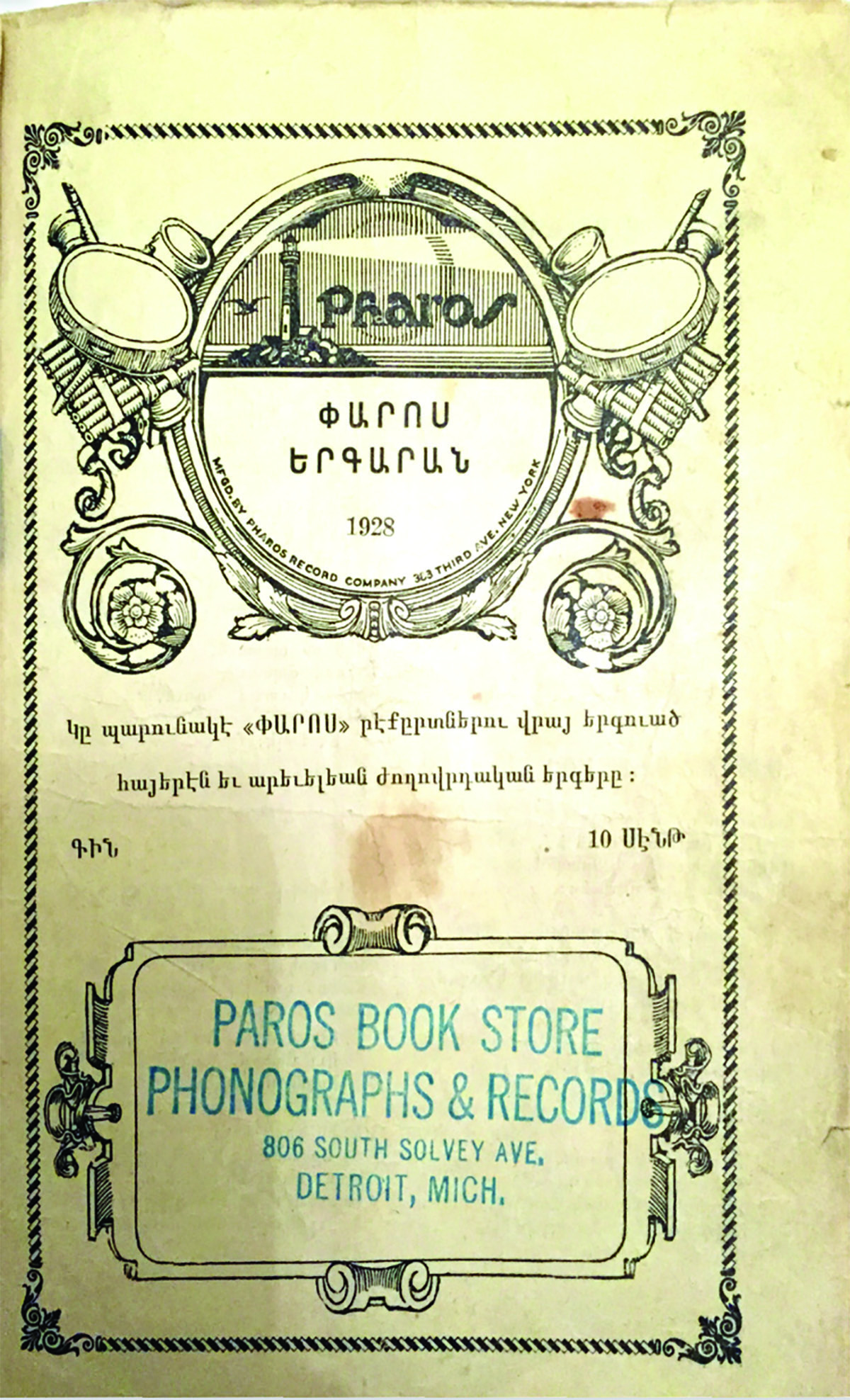 The second song, “I Went into the Garden,” in dialectal Armenian, is quite different. According to a pamphlet printed in Detroit, it was performed by a local vocalist in Palmer Park on Sunday, July 22, 1928. Unlike the recording by Wardini, which reaches for a kind of cosmopolitanism that stretches from the recording studios of Metro Detroit to the lagoons of Venice and the Nile of Egypt, the cosmopolitanism of “I Went into the Garden” is harder to read. Like many Armenian (and, more broadly, Middle Eastern) songs and poetry, the song also evokes the searing agony of being separated from one’s beloved. Armenians, of course, have long participated in shaping Islamicate and Persianate musical cultures, drawing on the available constellations of themes, styles, tropes, and sometimes even plain words across many languages, and recasting them for an Armenian (and sometimes Christian) sensibility. This song is no different. It describes the quintessential meeting place for the lovestruck—the garden (or, Palmer Park, if one prefers)—as a forlorn lover wanders bereft of his/her beloved, haunted by an absent rose. The words s/he uses to describe the beloved (yar, aziz yar), common to many Armenian songs from the period, are not Armenian at all; rather, they formed a stock vocabulary in other Islamicate musical cultures, such as Persian and Turkish, for talking about love. In short, even in places where only one ethnic community might gather to hear and appreciate music, the subtle presence of other communities, cultures, and languages can often still be sensed, even in audible ways.