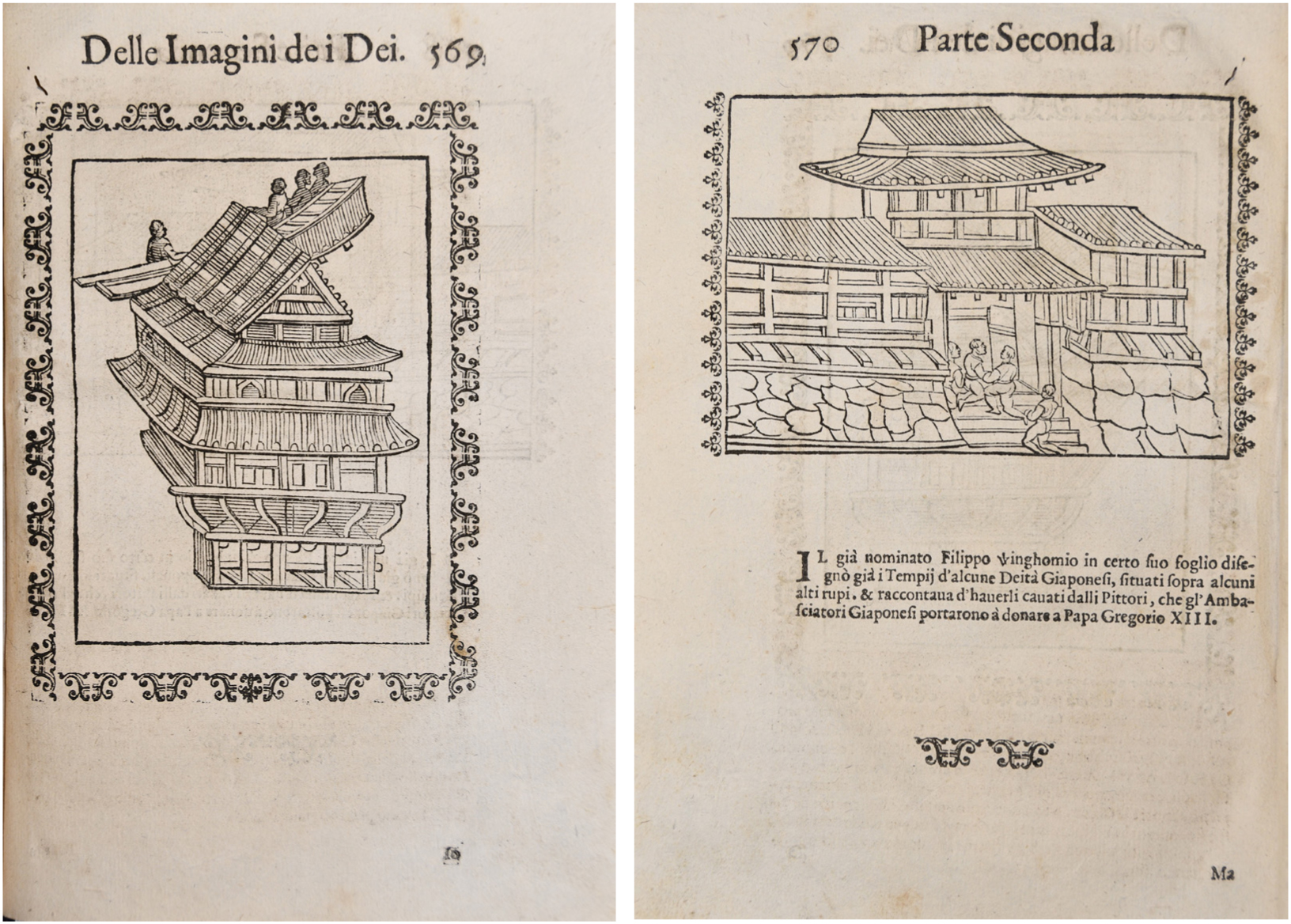 - “Il già nominato Filippo Winghomio in certo suo foglio disegnò già i Tempij d’alcune Deità Giaponesi, situati sopra alcuni alti rupi, & raccontava d’haverli cavati dalli Pittori [sic], che gl’Ambasciatori Giaponesi portarono à donare a Papa Gregorio XIII.” It was paintings, not painters, that were brought. Pignoria, Le imagini de gli dei de gli antichi (1624), 570. Translation by Anna Huber. ⮭