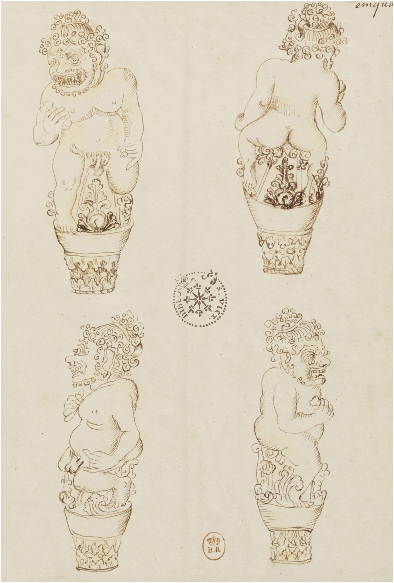 The process by which van Winghe’s sketches were translated into printed versions is only partially understood.39 After his death, van Winghe’s belongings were sent to Jérôme (also called Hieronymus) van Winghe (1557–1637), Philips’s brother and canon of the cathedral in Tournai. Aware of the value of his brother’s work to scholars and keen to have it acknowledged, Jérôme advertised the notebooks within his network. Among the people he showed and eventually loaned them to was Nicolas-Claude Fabri de Peiresc (1580–1637), a French polymath and central figure in early-modern European intellectual history.40 Peiresc is the critical link through which Philips van Winghe’s sketches found their way into Lorenzo Pignoria’s book. In a letter from Peiresc to Pignoria dated January 4, 1616, Peiresc makes clear that he had obtained a copy of Pignoria’s newly published 1615 edition of Imagini and, as his friend, offers a list of potentially useful objects for Pignoria for future inquiry.41 Included in the list among other objects is an image of the Mesoamerican god Quetzalcoatl and an image of a “temple of Japanese [people] at the peak of a mountain extracted from the paintings the Japanese ambassadors gave to Gregory XIII.”42 Only these subjects from the list (figs. 1, 2, 7) would subsequently be added to the 1624 edition of Imagini, and both are labeled as from van Winghe. A third addition to the 1624 edition—a set of four images showing different views of an Indonesian rakshasa carved on the handle of a kris—are not mentioned in the letter, but are credited in the accompanying text to Peiresc (see fig. 10).43