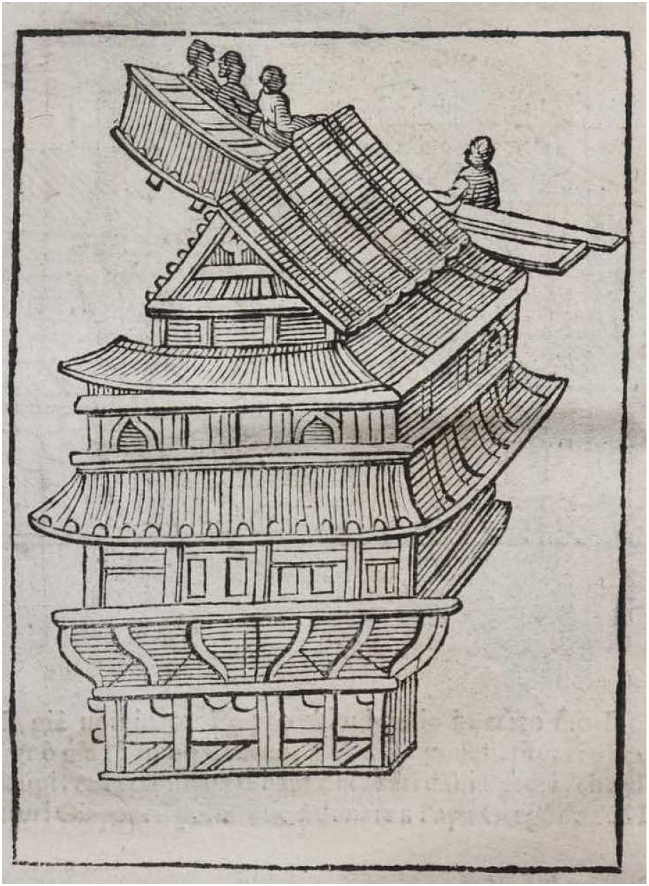 While the apparent misidentification of Azuchi Castle as a temple in Pignoria’s caption seems to confirm a limited knowledge and awareness of Japan on the part of its authors, I would propose that these motifs were not arbitrarily documented. Rather, and to foreground a key point in this article, I propose here that Page 569 represents a significant building within the Azuchi Castle grounds known as the Bishamon Hall 毘沙門堂 of Sōkenji 摠見寺. Its very selection from among the many options offered by the screens may tell us much about how Nobunaga and his castle-palace were imagined by the Jesuits and, through them, by commentators in Europe. The investigation of these pages will show that even the smallest vestiges, surviving in the form of copies of copies, can help reconstruct important threads of reception and interpretation. These threads ultimately bring us back to Mount Azuchi at the time of its greatest historical glory and allow us to further understand a moment when the entire nature of Japanese sovereignty appeared to be changing rapidly.