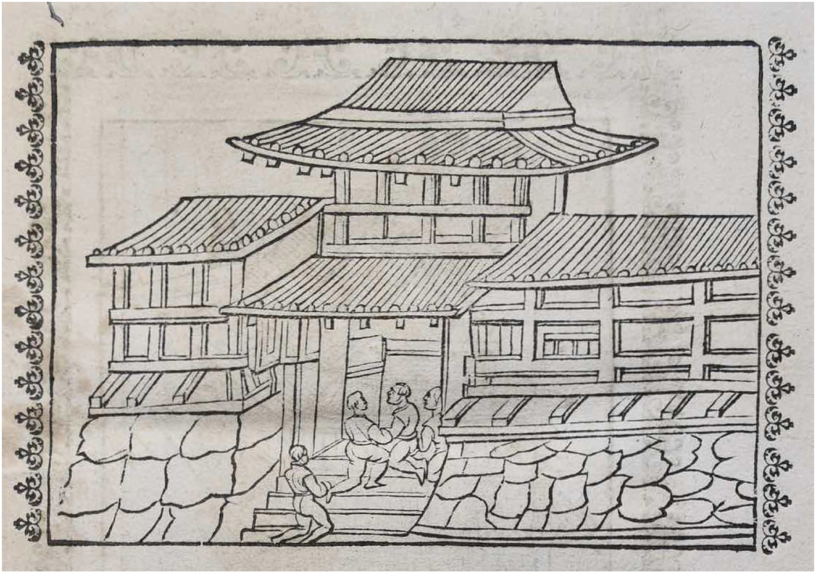 Before moving on to the implications of this reading of Page 569, a brief word is required about Page 570. Although it is the easier of the two images to read, identification of its subject remains elusive. Depicted is a two-level gate capped with a tiled hip-and-gable roof and with walling characterized by exposed beams and lintels (shinkabe-zukuri 真壁造), similar to the exterior of the Maruoka Castle tenshu 丸岡城天守 in Fukui 福井 (fig. 20).63 Four kneeling figures sit on the staircase leading up to the gate’s threshold. Beyond them and within the gate stands a wall that corrals the path at a sharp right angle—an important detail that clarifies the gate as a masugata 枡形 type, a standard gate typology in Japanese castles characterized by perpendicularly set doors. In the foreground and flanking the staircase is a drystone wall with a board roof (naga-itabuki 長板葺き). While multiple masugata gates have been found within the Azuchi Castle ruins, excavations to date have yet to identify traces of foundation stones or walls that correspond to the structures depicted.64 While frustrating, this absence of a clear parallel is also revealing as it disqualifies multiple masugata gates, such as the ōtemichi and several other excavated gates on Mount Azuchi, and in turn tentatively opens the possibility for determining its identity based on an identification of the Page 569 building.