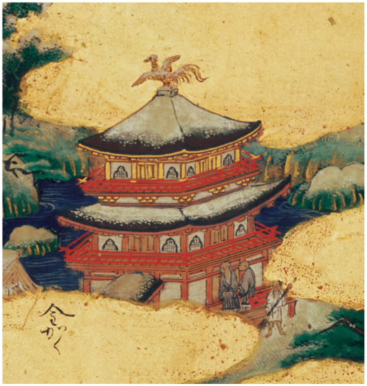 The dimensions of the central building’s first level may be posited as three bays deep and, extrapolating from this dimension, three to five bays wide.55 This reading of the building’s first-level depth is rooted in an essential clarification. On the right side of the building is an apparent copy error by van Winghe and/or Esengren in the form of a smaller “half-bay” (see fig. 14) that suggests the building’s side is four bays deep. This half-bay, however, should be read as the leftmost bay of the building’s façade. The origin of this copy error is readily apparent through comparison with Eitoku’s depiction of the Golden Pavilion (Kinkaku 金閣) of Rokuonji 鹿苑寺 (also known as Kinkakuji 金閣寺; fig. 15) in the Uesugi Screens. The angle at which the right side of the Golden Pavilion recedes, particularly on its second story, is so wide that if not copied precisely the foreshortening can easily be misread as an additional bay. That this is a copy error is further demonstrated by the second-level cusped windows (katōmado 火灯窓), decorative features typically situated in symmetrical fashion in the outermost bays of buildings.56 The right window of the Page 569 building should, like the left side, have only a single column to its right. It follows that the building’s second level can be confidently posited as three-by-three bays.