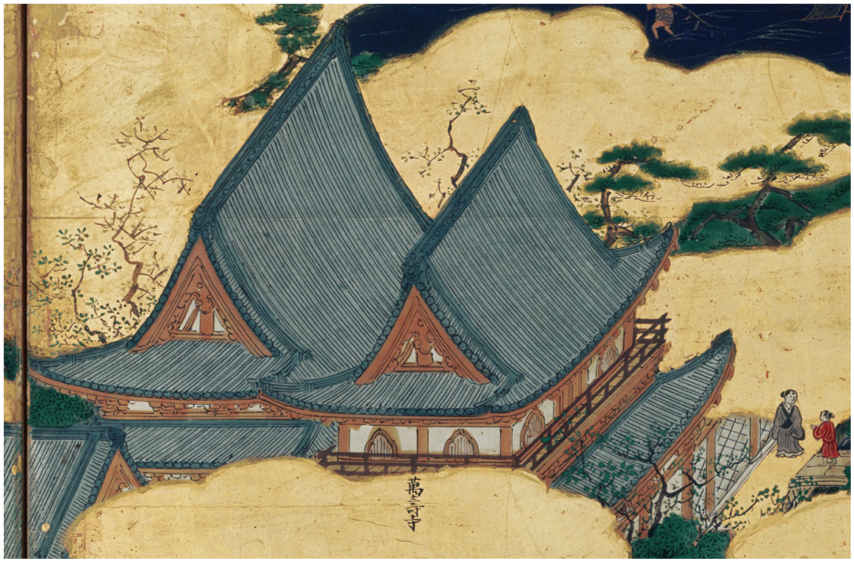 Only one building remains: the Bishamon Hall. Easily identifiable in the 1805 print as the largest, highest-reaching, and most central structure, its importance within Sōkenji is immediately appreciable. While it is impossible to know the manner in which it was depicted by Eitoku, the building’s core attributes—that is, central, multistoried—also likely made it stand out from its neighbors. In sum, the precise reason that van Winghe was attracted to the Azuchi Screens and specifically the two buildings he sketched is unknowable, but both motive and means exist.