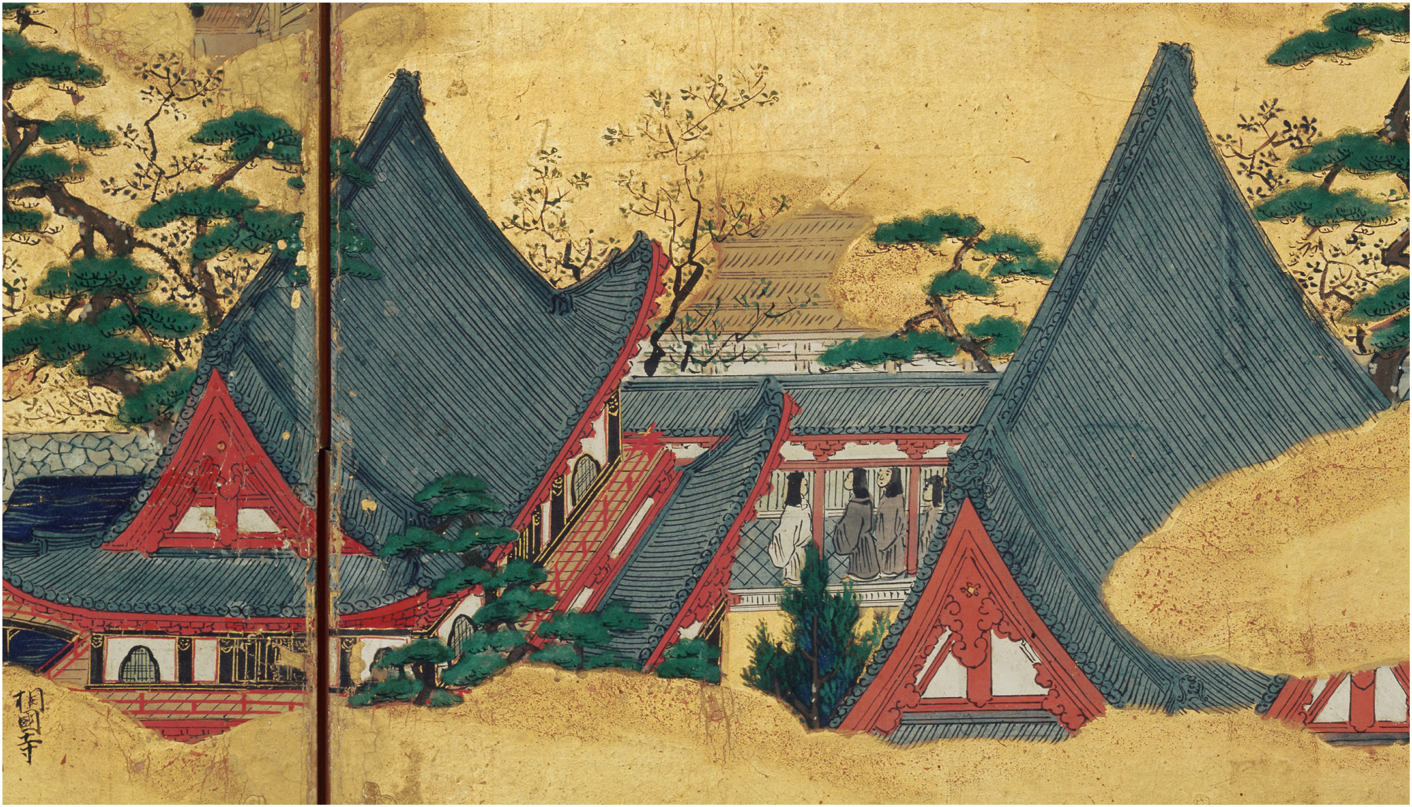 Although the building’s context does not offer additional direct evidence to support this reading of the Page 569 building as a Buddhist hall, it is consistent with such an interpretation. The background structural element—crossing behind the ridge, gable, and rightmost hip of the central building—contains multiple hints that it is either the roof of a connecting corridor or surrounding wall. Within Eitoku’s other cityscapes, only two types of structures extend out from the backs of gables. The first of these is an adjacent overlapping gable such as those depicted in the Uesugi Screens rendering of the Manjuji Buddha Hall 万寿寺仏殿 (butsuden) and Main Gate 三門 (sanmon) (fig. 16). The second type is a roofed corridor, exemplified in the Uesugi Screens depiction of the Shōkokuji Buddha Hall (fig. 17). While the left projection of the Page 569 building shares the same shape as an overlapping gable, its patterning of parallel lines with half circles at their base and intermittent squares below clearly identifies the structural elements as tiled eaves and not a gable. This reading is corroborated by the rendering of the figures on top of the structure. Figures truncated from the waist up, such as those depicted in Page 569, are without exception in Eitoku’s other cityscapes situated within courtyards and beyond a roofed corridor or wall (fig. 18). Accordingly, the placement of another truncated figure on the projection to the right of the gable suggests that its upper trapezoidal member is a continuation of the leftmost projecting corridor or wall.