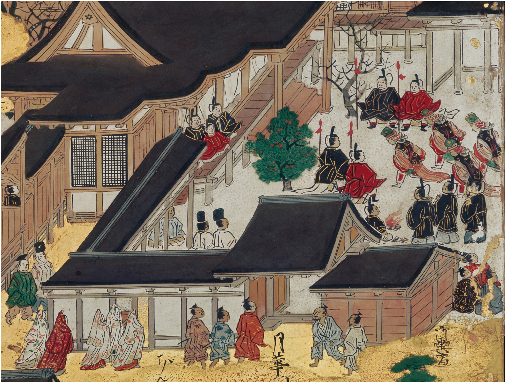 - The attribution to Eitoku is based on an entry discussing the screens in the imperial diary Oyudono no ue no nikki 御湯殿上日記, ed. Hanawa Hokiichi 塙保己一, in Zoku gunsho ruijū kansaikai hoi san: Oyudonono ue no nikki (7) 續群書類従・補遺三:御湯殿上日記 (7) (Continued literature compedium • Supplement 3: Diary of the palace attendant women serving ‘Beyond the Bath’ [7]) (Tokyo: Zoku Gunsho Ruijū Kanseikai, 1934), 373. Issues related to this attribution are discussed in Tsuji Nobuo 辻惟雄, Sengoku jidai Kanō–ha no kenkyū: Kanō Motonobu o chūshin to shite 戦国時代狩野派の研究―狩野元信を中心として―(Research on the Kanō School in the Warring States period: Centering on Kanō Motonobu) (Tokyo: Yoshikawa Kōbunkan, 1994), 264; and McKelway, Capitalscapes, 165. ⮭
