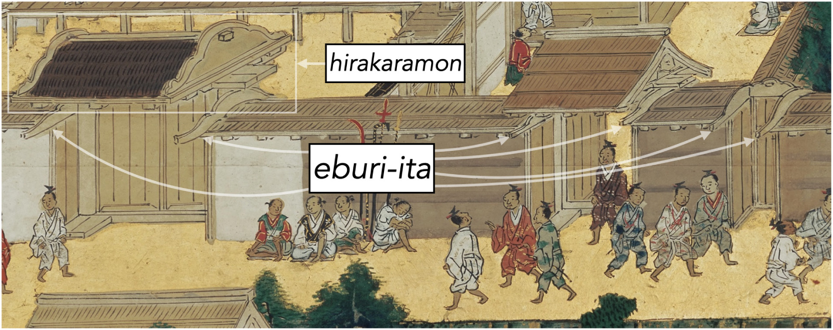 Returning to the matter of context, the foreground structural element remains the most difficult part of the image to read, but one key attribute suggests that it is also part of a gate, wall, or corridor. The lower register of the structure lacks any direct parallel in Eitoku’s cityscapes and, consequently, remains tantalizingly ambiguous. The upper register, however, contains two sets of three elongated and mirrored S-shaped forms. Their distinct shape corresponds to only two forms found in Eitoku’s other cityscapes: eburi-ita 柄振板 (lit., hoe board) and the left gables of hirakaramon 平唐門. Eburi-ita are decorative cusped wooden boards that are attached to the ends of wall roofs where the wall connects to a gate or where there is an end to a wall. A hirakaramon is a type of gate with undulating or cusped bargeboards on the sides of its roof. Eitoku’s treatment of eburi-ita represents another signature habit of brushwork. In contrast to cityscape artists who either entirely omitted or cursorily rendered eburi-ita, Eitoku invariably rendered this fixture as pronounced in height and rising well above the wall that it serves (fig. 19).62 Although the S/ shapes in the Page 569 building appear as more condensed and in greater number than in any single example of eburi-ita or hirakaramon within Eitoku’s other cityscapes, their distinct shared shape and the lack of anything even close in resemblance suggests that they are likewise cusped boards and positioned in a context where such fixtures are typically found, namely as part of gates, walls, or corridors. In sum, the central building appears to be situated between these architectural typologies. While Azuchi contained many such walled-off areas of varying function, one common place to find such structures is surrounding a temple complex and temple buildings—that is, the setting of a Buddhist hall.
