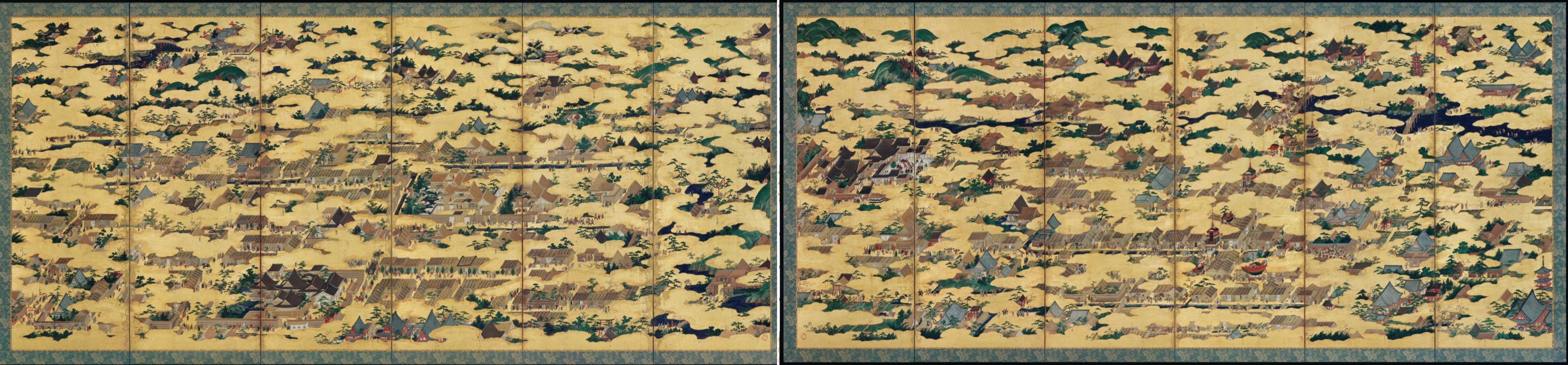 - Based on comparisons made in person and using various reproductions. Hayashiya Tatsusaburō 林屋辰三郎 et al., eds., Rakuchū rakugai 1 洛中洛外 1 Kinsei fūzoku zufu dai-3-kan 近世風俗図譜第3巻 (Illustrated catalogue of early modern genre scenes) (Tokyo: Shōgakukan, 1983); Kawashima Masao 川島将生 et al., eds., Rakuchū rakugai 2 洛中洛外 2, Kinsei fūzoku zufu dai-4-kan 近世風俗図譜第4巻 (Tokyo: Shōgakukan, 1983); Tokyo Kokuritsu Hakubutsukan 東京国立博物館 and Nippon Terebi Hōsō Mōhen 日本テレビ放送網編, eds., Tokubetsu-ten Kyotō—rakuchū rakugai-zu to shōhekiga no bi 特別展京都-洛中洛外図と障壁画の美 (Special exhibition: Kyoto—The beauty of rakuchū rakugai paintings and sliding door paintings) (Tokyo: Nippon Terebi Hōsō Mōhen, 2013). ⮭