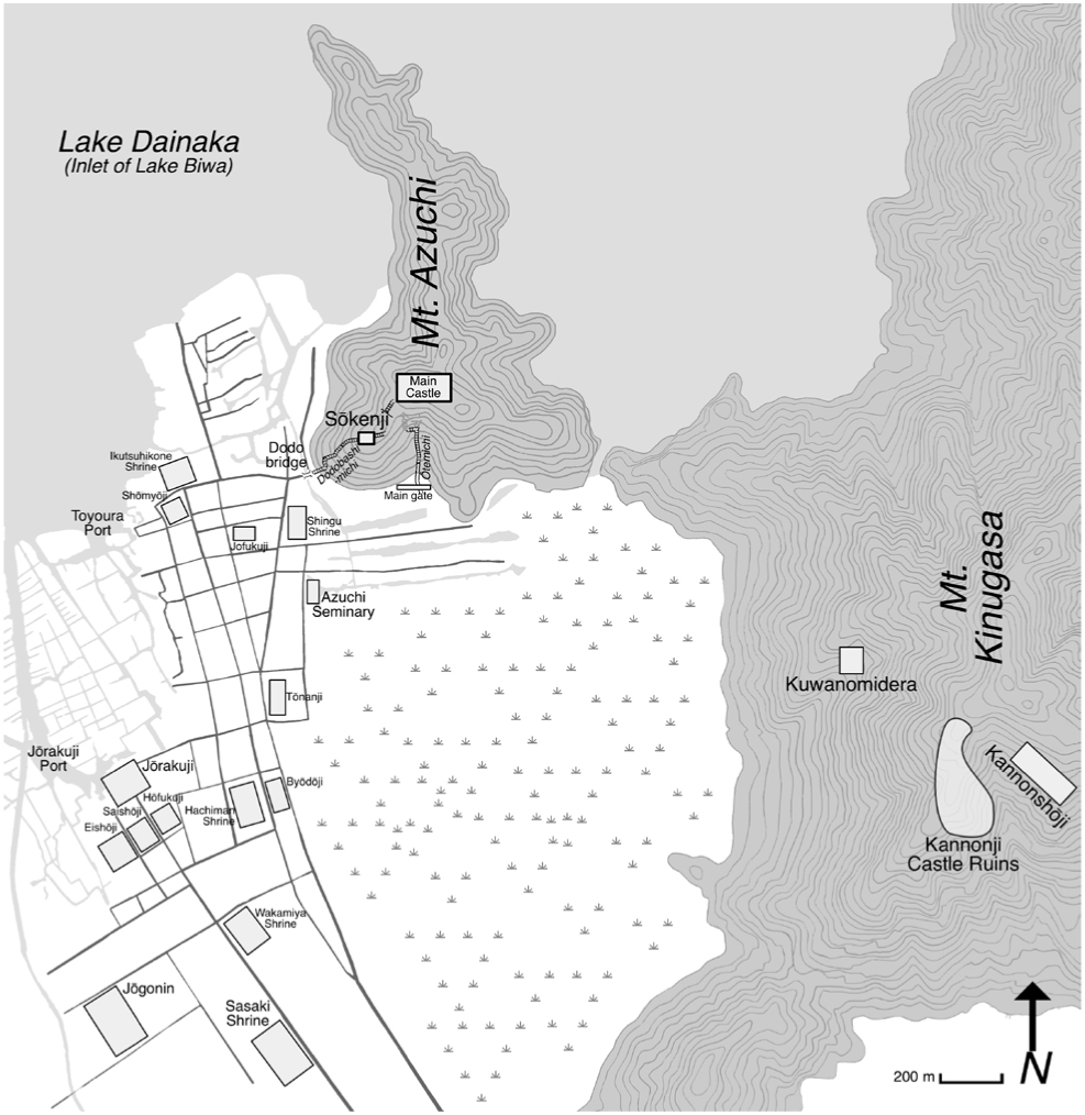 - The grid pattern is noted in Coelho, “Carta annua de Iapaõ,” 2.1, 36v. Mention of men riding oxen suggests the presence of rice paddies; Teodoro Panizza to Cardinal d’Este, April 5, 1585, transcribed in Tokyo Daigaku Shiryō Hensan-jo 東京大學史料編纂所, ed., Dai Nihon shiryō dai jūichi hen bekkan no ichi tenshō kenō shisetsu kankei shiryō ichi 大日本史料第十一編別巻之一天正遣欧使節関係史料一 (Greater Japan primary sources, vol. 11, suppl. no. 1, Materials related to the Tensho Embassy), Dai Nihon shiryō (Tokyo: Tokyo Daigaku, 1959), 246. Houses and infrastructure are mentioned in Fróis, Historia de Japam, 3:260. The presence of vassal estates is assumed based on their forced relocation to Azuchi; see Lamers, Japonius Tyrannus, 140–48. ⮭