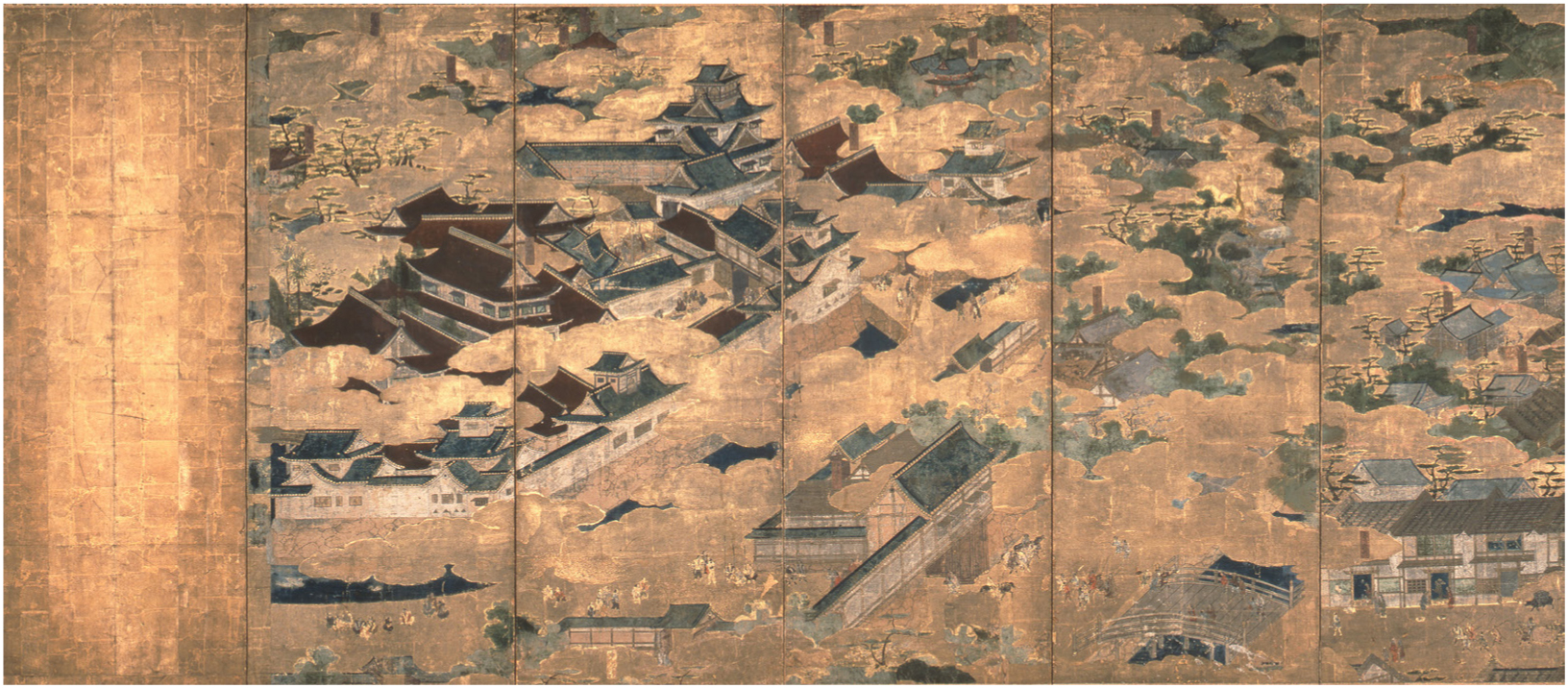 Clues to Eitoku’s approach to rendering the “castle-screen” may be deduced via another analogous cityscape: the Mitsui Memorial Museum’s Jurakutei Screen (Jurakutei-zu byōbu 聚楽第図屏風, fig. 6).24 Jurakutei 聚楽第 was a castle complex constructed in 1585 by Nobunaga’s successor Toyotomi Hideyoshi 豊臣秀吉 (1536–1598) in the heart of the capital and was one of the first post-Azuchi castles. Like Azuchi, the palatial castle estate served as a base of operations and residence.25 The Jurakutei Screen was executed slightly later, in the early 1590s, by an unidentified artist from the Kanō atelier. Like the Uesugi and Scenes of Amusements screens, the painting renders its subject panoramically, employing billowing gold clouds to both organize space and selectively reveal a sprawling urban landscape beyond.26 The composition is arranged around a central apex, the Jurakutei tenshu, situated at the top of the fourth panel from the right. Spreading out below it and corralled by a wall and moat are the buildings of the castle’s inner bailey.