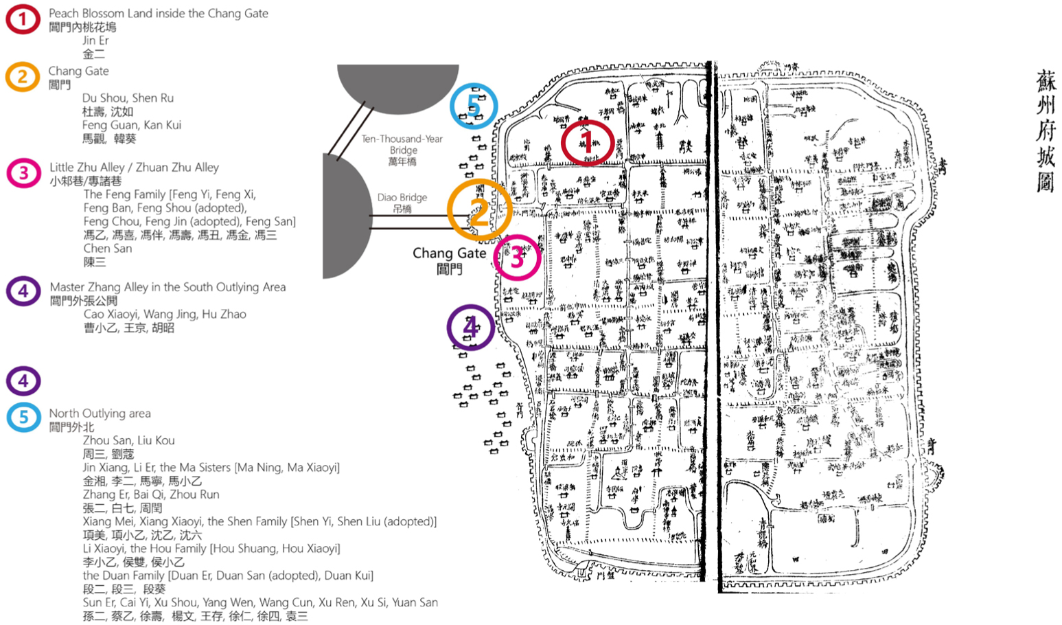 若要论证市场与青楼剧场之间的关联,需借助财产清单及其他重要历史文献,例如物质文化研究者发现的那些揭示早期近代欧洲戏剧物品在剧院外循环利用与改造的史料。20遗憾的是,在中国早期近代研究中此类原始资料较为匮乏。目前我们能做的,是拼合苏州地区的历史图像呈现、晚明苏州名妓图录及地方志地图【图2】,从而揭示苏州市井画坊与青楼区域显著的空间重合。艺术史家高居翰(James Cahill)与梁庄爱伦曾研究晚明商业实践中出售"次等摹本"与"代作"(即赝品)背景下的美人图。21在多个摹本画作交易中心中,苏州最为突出。由苏州画匠制作的"苏州片"——这种"品类异常庞杂的绘画商品"——常见于阊门附近的街市(如桃花坞与专诸巷)。22仇英作为苏州最受欢迎的设色人物画家,其名号在苏州片店铺中尤为抢手,部分托名于他的卷轴画可能即产自这些作坊。如【图2】所示,在晚明苏州名妓图录《吴姬百媚》(1617年序)中,阊门区域是最常提及的居所。23仇英范式的画作与名妓聚居区共生共荣,而专攻旦角的名妓也在此地崭露头角。这些画坊与青楼是否拥有共同的消费者群体尚属推测,但可以肯定的是,晚明时期青楼、戏苑、苏州片店铺及衍生产品形成了相互滋养的商业生态。随着明朝覆灭,以苏州片店铺为核心的商业区、相关戏剧题材及名妓女伶群体亦随之式微。