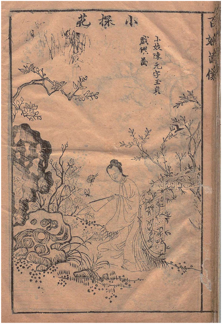 真实的青楼女子与美人图中的虚构女性采用了相同的表现手法。吴伟(1459-1508)为名妓武陵春所作的纪念肖像【图3】是以真实妓女命名的画作的一例,尽管这种画作极为罕见。24仇英开创的美人图式更通过绘画与木刻版画的媒介转换广泛传播,在各类青楼女子图录中得以应用。最典型的案例当属十七世纪初期刊行的青楼图录。25这些图录实际上是当地名妓的宣传手册,常以标注姓名与品级的版画形式呈现知名妓女形象。26插图多展现顾客可与这些才艺出众的女子共享的文化活动与休闲场景,如饮酒、骑马、登山、弈棋、扑蝶等【图4、5】。27通过对比上述四例可见,画家的笔触往往被技艺精湛的刻工忠实转译。这种图像标准化实践使得女性形象得以从美人图向木版印刷进行跨媒介迁移——标准化处理为跨媒介复制与批量生产提供了便利。