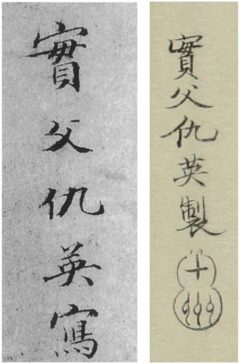 无论是彩绘的北京本【图6】还是黑白的早稻田本,都带有仇英的印章和署名。这些特征也常见于其他归其名下的真伪画作之中。其署名形式以别号"实父"居上、本名"仇英"列下,与现藏于堪萨斯市纳尔逊-阿特金斯艺术博物馆的《浔阳送别》图(疑为伪作)上的署款形式相似。28画中"十洲"(仇英别号)印章的形制,与其被公认为真迹作品上的鉴藏印高度吻合【图7a、b】。29