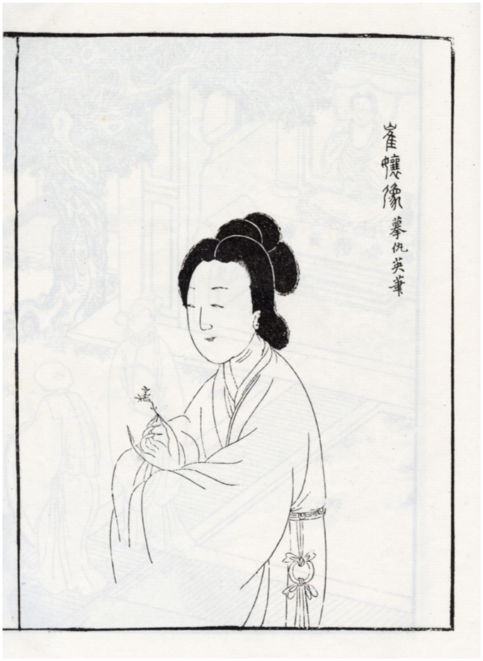 崔莺莺的形象在晚明时期以仇英的美人图范式出现。以1616年刊本卷首所载崔莺莺画像【图11】为例,该作品明确标注其以仇英画作为原型。观者可以细品这幅静态画像所蕴含的真实女性的灵动气韵,并想见一个精妙而魔幻般的画像"活化"过程,不再是凝固的笔墨,而是通过舞台演绎抑或文本再现,实现其艺术生命的完美动感。
