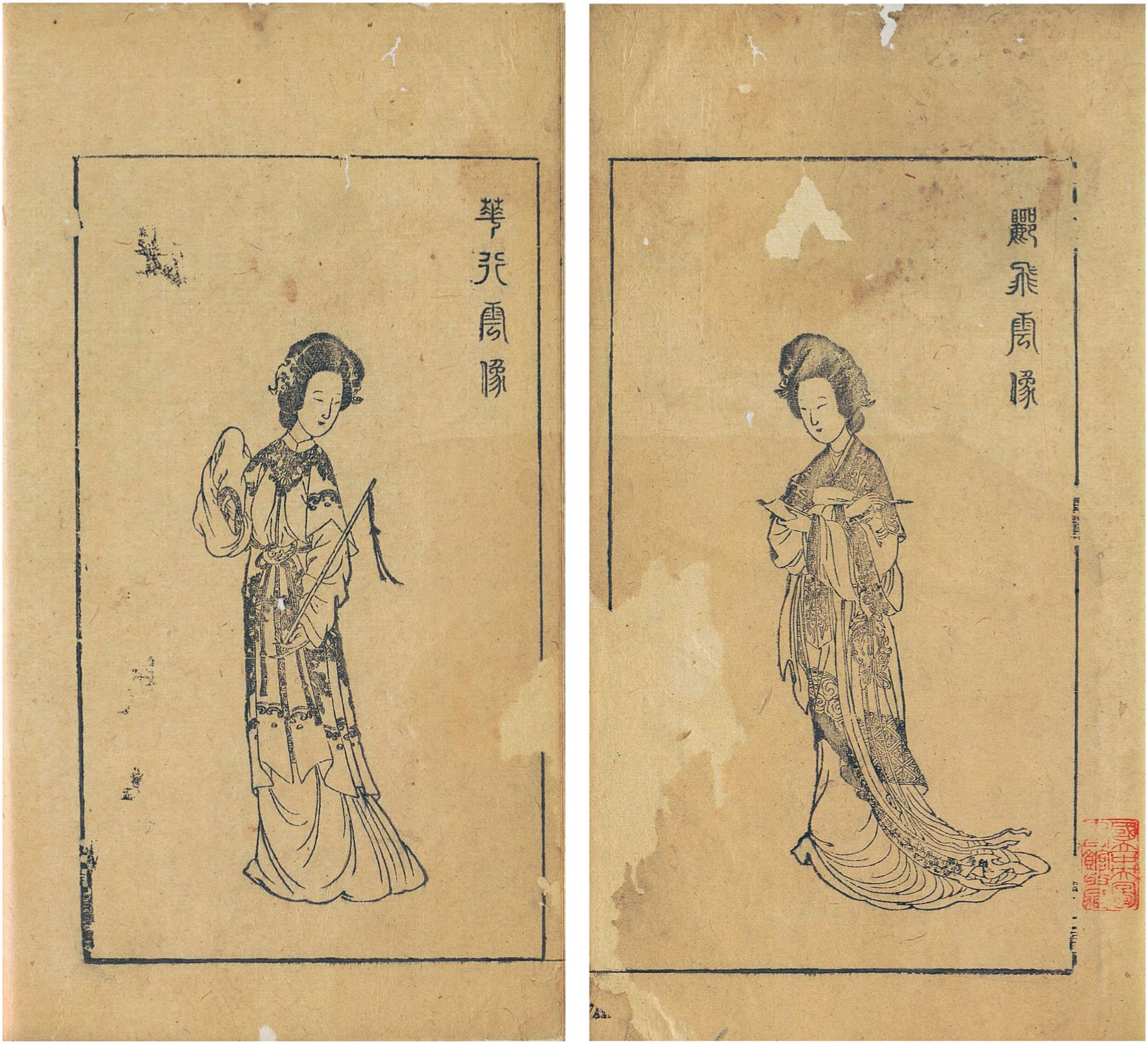 明末怀远堂木刻版《燕子笺》的卷首同样收录了无名画师与刻工所绘的两位女性角色画像【图14a、b】——小旦饰演的华行云(妓女)与旦角饰演的出身高贵的郦飞云。与《百美图》长卷中的六十幅角色画像相似,这两幅画像呈现出典型的仇英风格美人形象,其头部微倾的姿态又隐约透出陈洪绶的笔意。画中人物的配饰细节强化了这样一种意象:这些角色形象仿佛随时能在戏曲舞台上被“唤醒”。例如,大家闺秀郦飞云手持一页诗笺,她即将题写的诗句会被燕子(极可能由身着燕子戏服的演员在台上模拟)从案头衔走,随后飘落至男主角手中——此即剧名《燕子笺》的由来。而妓女华行云则握着一支细长的箫(晚明妓女的标志性乐器)。她的身姿与手势暗示着精湛的演奏技艺:箫身并非托于掌心,而是轻搭指尖,纤长的指甲尤为醒目。观者在欣赏这些木刻版画时,实则是通过图像化的方式进入故事的情境之中。