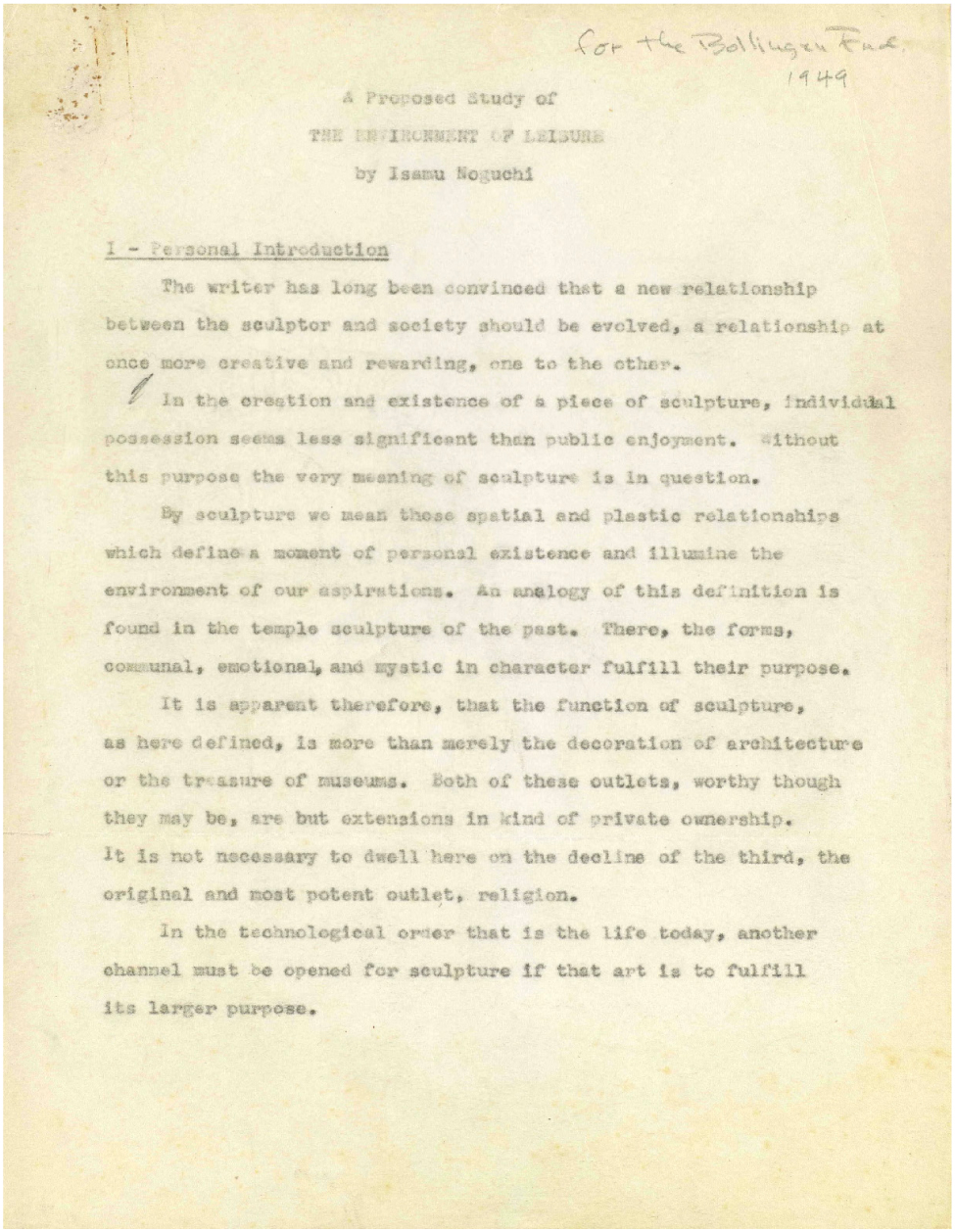 - Isamu Noguchi, “A Proposed Study of the Environment of Leisure,” 1949, p. 1, MS_WRI_010_019, Noguchi Archive. ⮭