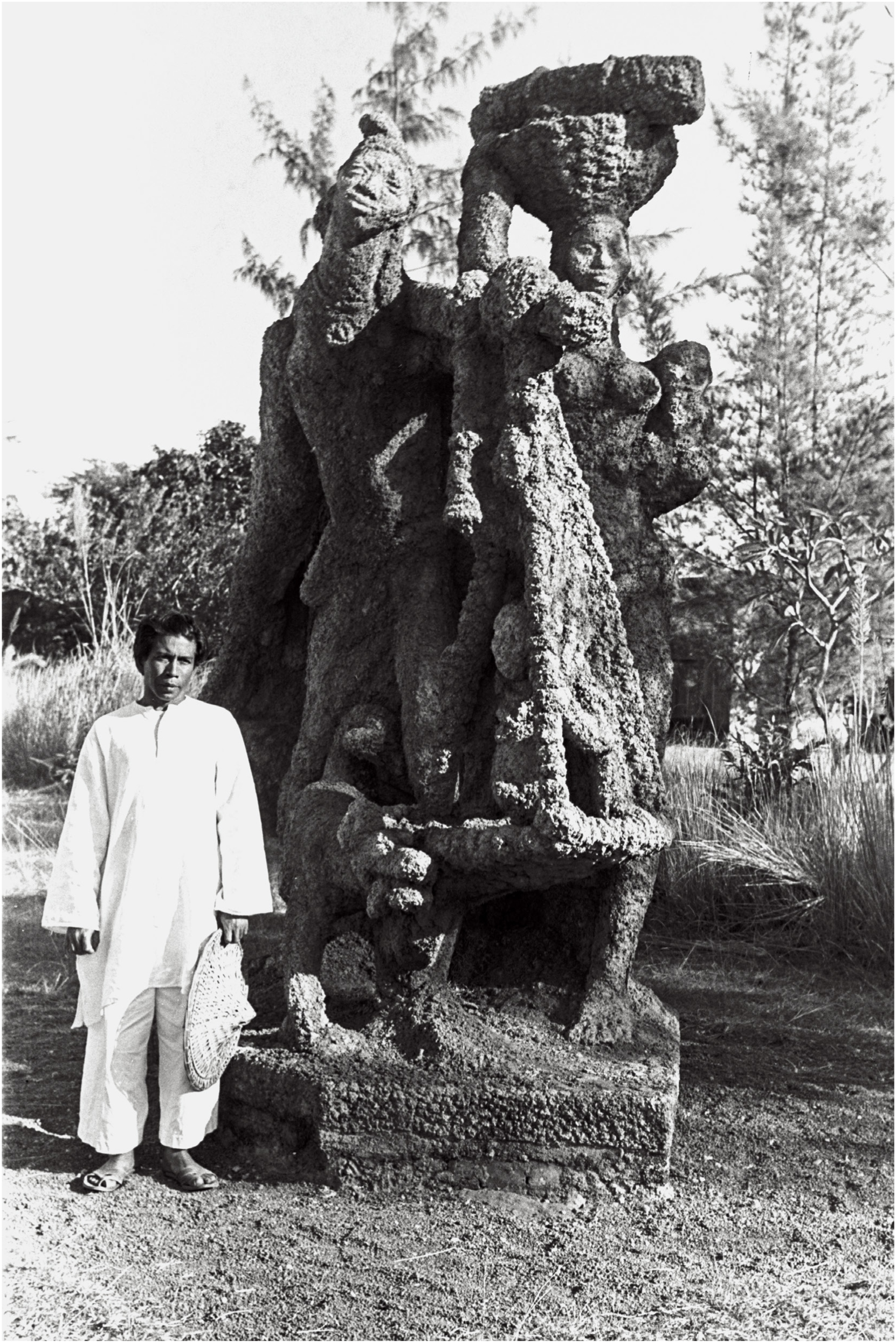 At the time, several Indian artists and intellectuals were interested in the long history of stone carving, and Noguchi found a kinship with them. He visited Kala Bhavan, the arts faculty at Visva Bharati University in Shantiniketan, established by poet laureate Rabindranath Tagore, who for years had invited visits by thinkers such as Stella Kramrisch in 1922 and the poet Yonejiro Noguchi, Noguchi’s father, in 1935–36.30 Noguchi traveled to Shantiniketan by train from Calcutta (Kolkata). There he met Ramkinkar Baij and Nandalal Bose, who, along with Benode Behari Mukherjee, formed a pioneering group of artists active after the Bengal famine of 1942–43. Noguchi made several portraits of Baij, sketched the artist, described him at length in a note entitled “The Sculptor of Santiniketan,”31 and reflected, “It is to Ramkinkar that I was drawn, as a person and for my interest in sculpture.”32 He photographed Baij standing next to his Santhal Family (1938), one of India’s first modernist public sculptures exploring the theme of human dignity in labor and suffering (fig. 3).