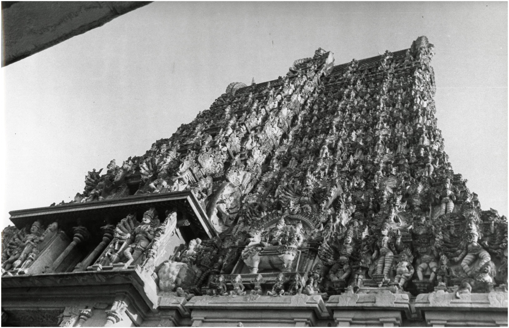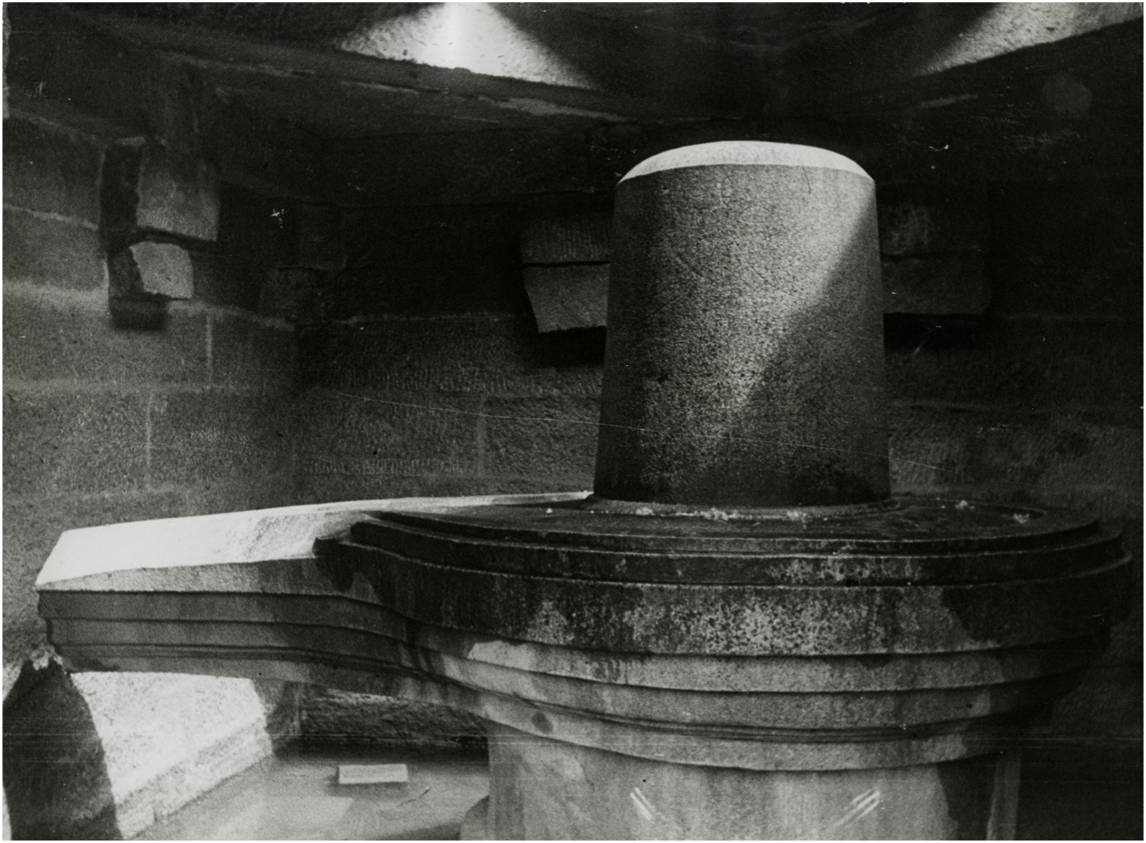 Noguchi traveled from Delhi to Madras and then to several ancient sites. One of his first visits was to the Hindu temples of Madurai and Chidambaram, built between the tenth and twelfth centuries CE. He traveled by train from Madras, where he stayed with his friend Uday Shankar, a pioneer of modern Indian dance, who arranged the trip. His journey was informed by a familiarity with the pillared temple hall from Madurai in the permanent collection of the Philadelphia Museum of Art and Coomaraswamy’s book The Dance of Śiva (1918), which references the temple at Chidambaram.38 At Madurai, Noguchi photographed the temple gopurams, or pyramidal ceremonial towers, specifically capturing their dramatic height. In one of his photographs, a gopuram skews gently into a curve against a cloudless sky (fig. 4). This exaggerated scale was essential to communicate the structure’s monumentality. In his notes on Madurai, Noguchi also describes observing a monolithic Shiva lingam, an aniconic representation of Shiva, a form he would photograph on a later visit to Hampi (fig. 5), the capital of the Vijayanagara Empire, where temple ornamentation achieved a heavily elaborated style.39 Furthermore, at Chidambaram, Noguchi took twenty photographs at the temple dedicated to Shiva Nataraja, Shiva as Lord of Dance, which he described as a “temple of dance, drenched with sun. Its huge surface is entirely populated by figures of the dance, of pale pink sandstone, round of hip and limbs, in joyful abandon.”40 Noguchi was drawn to the illusion of movement achieved in the plasticity of the stone carving, depicting numerous poses from Indian classical dance. The monumental temples of Madurai and Chidambaram offered introductory insights into the fundamental drama, density, and dynamism of early Indian stonework.