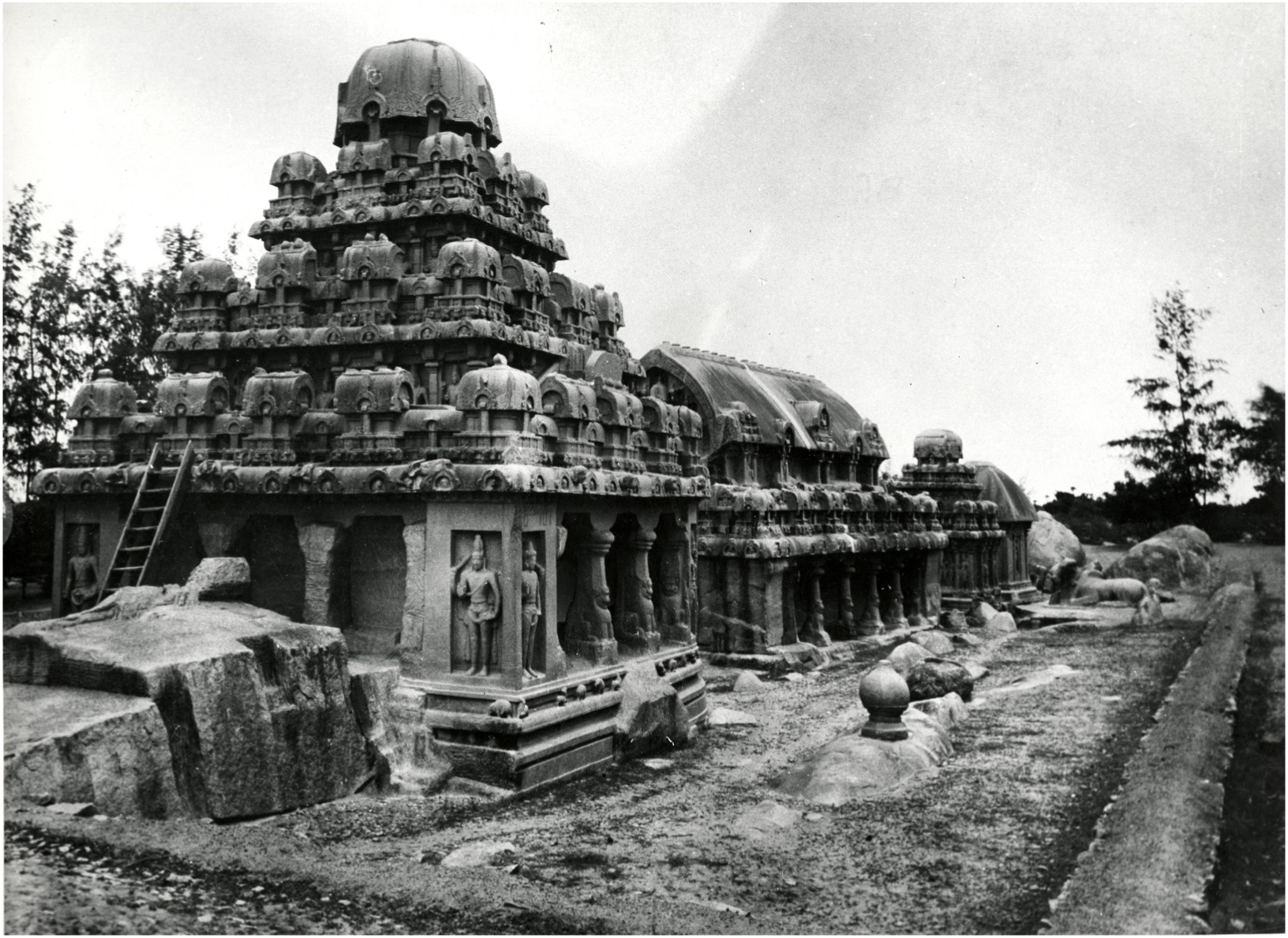 Returning to Madras in October, Noguchi hired an auto-rickshaw to visit the site. The complex at Mahabalipuram dates to the Pallava period in the seventh and eighth centuries CE and consists of a cluster of carved boulders that dot the Bay of Bengal coastline. Approaching the complex, Noguchi noted the Pancha Rathas (Five Chariots), a group of five monolithic temples carved out of monumental boulders that occur naturally along the shore. These structures have no precedent in early Indian architecture and are considered prototypes for the later temples of southern India, such as those Noguchi saw at Madurai and Chidambaram. His reference to an “outcropping of rock carved in the shape of small temples”42 shows a keen attention to the close relationship between architecture and sculpture discernible here: the boulders are directly cut, carved, and shaped into monolithic architectural edifices. His photograph of the Pancha Rathas shows a diagonal row of four temples, receding by height into the background, each architecturally distinct from the next but elevated on a shared plinth (fig. 6). A ladder in the foreground leaning against the Dharmaraja Ratha, the tallest of the temples, indicates that Noguchi must have examined the distinctive architectural kudus, or small ornamental “shrines,” sculpted along the tiers of the temple tower. The photograph was taken from the southeastern corner of the plinth, which reveals the unfinished quality of the lower facade, including a boulder rudimentarily cut to be carved, suggesting that the temples were made from the top down. This unfinished quality would be of interest to any sculptor, as incomplete works reveal the processes of stone carving more intimately than finished work.43