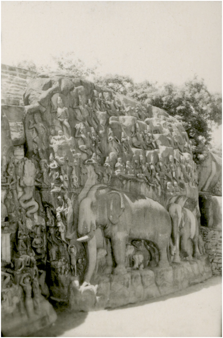 The Great Penance faces the sea to the east, where the five-storied structural Shore Temple is located. This temple is not carved from a natural boulder, as in the case of the Dharmaraja Ratha, which it seems to emulate and is one of the earliest structural temples in southern India. It does not exemplify the convergence of sculpture and architecture, particularly one that seems to emerge from the earth itself, and where ancient sculptors would have gone to the stone rather than bringing the stone to them. However, the temple’s distinctive location presented Noguchi with an opportunity to reflect on the relationship of stone, time, and nature. In a photograph, he positioned the temple in the right middle ground, while his primary focus was on the adjoining compound, bordered by a row of sculpted figures of Nandi, Shiva’s bull mount, that delineate the space from the sea in the background (fig. 8). The silhouettes of these figures, naturally softened by the rhythmic crashing of waves against the monument, are striking. Noguchi contemplated, “Time and the tides have left this spot guarded only by the seated rows of cows, as irresistibly beautiful as it could have ever been.”48 This evokes his earlier reflection on the sculpture of Mahabalipuram, which he viewed as presenting the “continuous changes that time gives.” Here, the stone was not unfinished, revealing its modulation by human hands; instead, it was sculpted down to an incomplete state by the forces of nature. As such, Mahabalipuram offered Noguchi the whole spectrum of the life of stone.49
