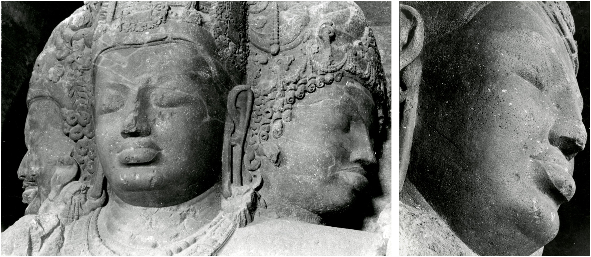Noguchi continued his study of sculpture in situ at the Elephanta Caves, dated to the fifth–sixth centuries CE, located off the coast of Bombay (Mumbai). The site was constructed through the laborious process of cutting caves into mountain faces, or “living rock,” and becoming part of the geological structure. The main cave has a triple-bayed entrance, which gives little sense of the astonishing depth of its interior, excavated more than forty meters into the mountainside. The cave features stone columns, brackets, and beams, which emulate structural elements but are, in reality, monolithic and cut directly out of the rock.50 Carved on the inner walls of the cave are nine monumental relief panels that depict aspects of Shiva. This includes the three forms of Shiva or Shiva Trimurti: a central, contemplative aspect flanked by a fierce profile on the left, representing Bhairava; and a peaceful portrayal, of Uma, on the right. Carved in full relief, and directly into the basalt rock face, the imposing composition is set deep within a central recess of the cave’s southern wall. Noguchi’s photographs of Shiva Trimurti show an interest in the “ever-changing relationship of volume and space” and the enlivening of stone surfaces. His photograph captures the three visages at eye level (fig. 9, left). Given that the sculpture is more than twenty feet high, Noguchi must have erected a ladder to photograph it. His picture is bold and tightly composed, barely containing within itself the sheer mass of the sculpted form. Another photograph is more closely focused on the profile of the central aspect (fig. 9 right). Here, Noguchi was less interested in the elaboration of sculpted adornments, which he entirely cropped out, than in the illusion of flesh achieved by ancient sculptors, particularly in the weightiness under the chin and lower lip, and in the texture of skin, communicated through the naturally mottled surface of the stone.