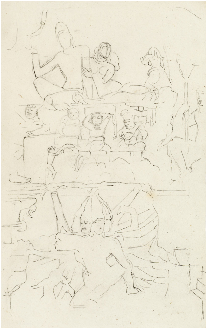 One of the nine panels at Elephanta depicts Ravana shaking Mount Kailasha, where Shiva and Parvati are seated. The panel is severely damaged, but Noguchi sketched the same scene at the rock-cut complex at Ellora, from the sixth–tenth centuries CE (fig. 10). Ellora consists of thirty-four accessible Hindu, Buddhist, and Jain caves excavated from the basalt cliffs of the Chandragiri Hills. All are exquisitely carved. Noguchi’s sketch is tightly packed, with no evocation of the cave in which the sculpture is set. It has been accurately argued that “to be able to make sculptures, it is important to know how things work, and in this sense, drawing is a way of looking or seeing . . . it is much easier to draw than manipulate weighty materials.”51 Drawing is an integral part of any sculptor’s practice, and Noguchi’s sketch is doubly pertinent: he was, after all, a sculptor without a studio. Rather than focusing on iconographic details, he studied the volume and arrangement of sculpted forms, their relationship to each other in terms of scale, and the overall “perception of space,” all of which only a sketch allowed him to fully comprehend in an embodied sense, relative to the instantaneous snapshot of the camera.