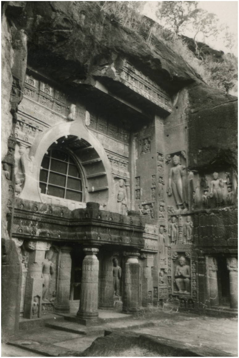 His attentiveness to sculptural volume and space inspired a related investigation of light in the carving of “living rock.” A sculptor must manipulate light against a surface, just as a painter creates light-effects within a work, but this is complicated in dark caves. At the fifth- century-CE complex in Ajanta, Noguchi photographed the rock-cut facade of cave 19, which consists of a giant stone window that provides the cave’s only source of light (fig. 11). This was an innovative formula devised in early Buddhist architecture for the organization of space through the modulation of light. Depending on the time of day and the season, an appearance of architectural weightlessness was achieved through variations in the light cast into the interior. The earliest caves included timber screens that, during subsequent periods, sculptors replicated in stone. While these original screens have not survived, curved teak ribs are present in the barrel-vaulted rock-cut Buddhist caityagṛhas, or prayer halls, of Kondane and Karla from the second and first centuries BCE. These ribs supported the timber screens that diffused light through monumental stone gateways.