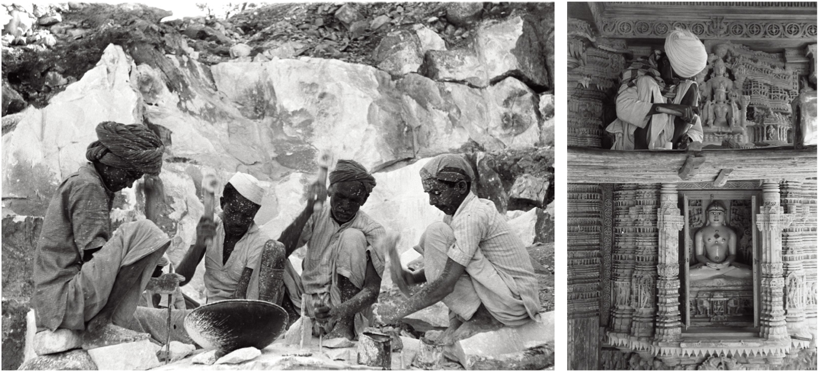 His study of the living tradition of stonework continued on a subsequent trip, where he joined Kasturbhai Lalbhai, a prominent figure in the textile industry and an art patron, on a visit to a stone quarry and to observe stone repairs at the Jain temples of Mount Abu and Ranakpur (fig. 14, left and right).55 His photographs from these visits emphasize the labor that is involved in the production of stonework. Noguchi seldom included people in his photographs of ancient sites in India, unlike eighteenth- and nineteenth-century colonial views of these places; when he did, they were often of stoneworkers. This is noteworthy since ancient sculptors remain largely unknown today, and his sensibility acknowledges the often- overlooked labor behind these monumental creations.