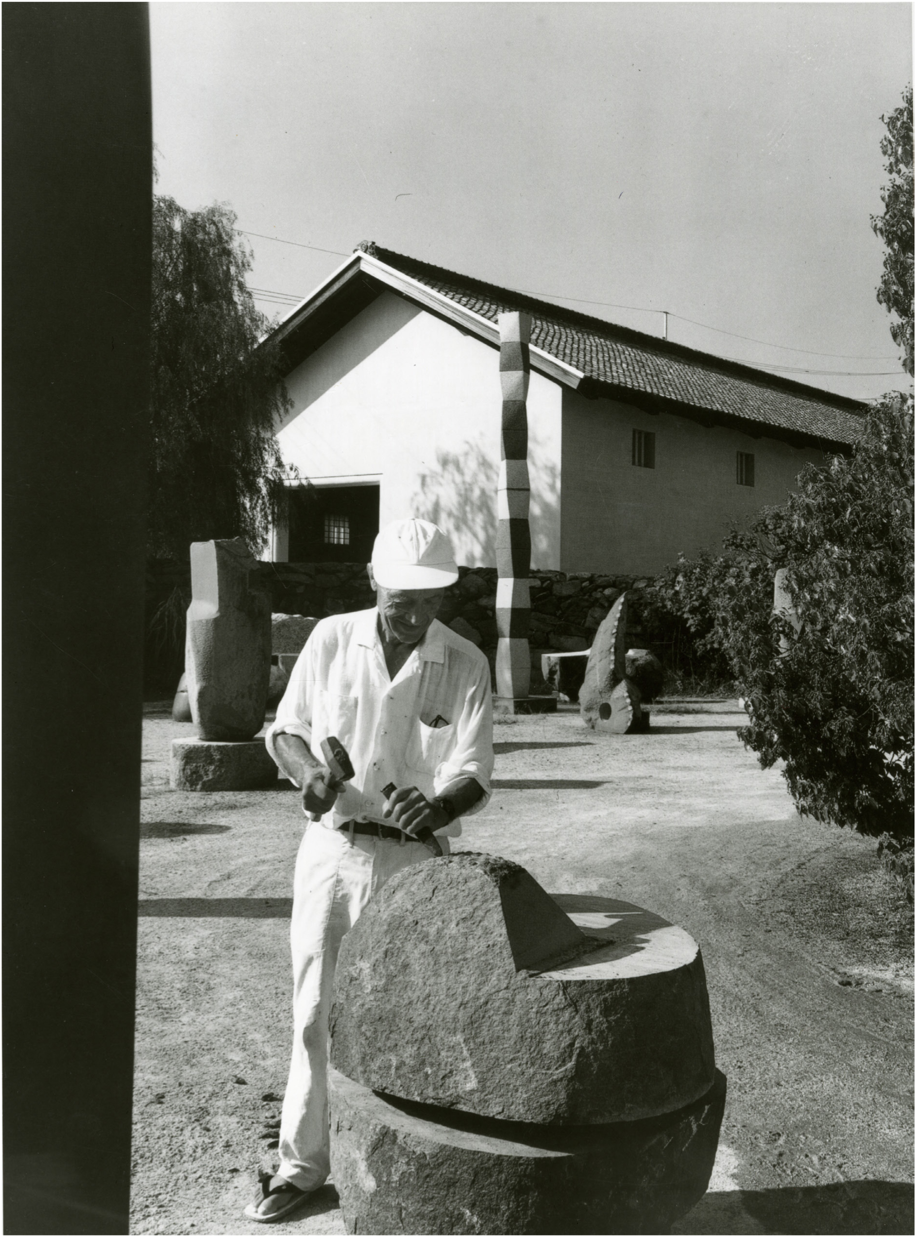 Noguchi’s sculptural inquiries were fundamentally possible because of his mastery of tools (see fig. 1). In his 1926 application for a Guggenheim fellowship, he had noted that he was still “deficient” in his mastery of tools and hoped to acquire the “necessary ability” in the “technique of stone.” He learned these skills, and the processes of stoneworking, in Brancusi’s studio, which grounded a career characterized by continually sharpening expertise and evolving innovations. “If you fossil a technique,” wrote Noguchi, “then you express [only] those things which the technique permits.”84 Over the decades, he developed unparalleled expertise in the seemingly irreconcilable use of both premodern tools, such as the hammer, axe, and chisel, and modern ones, like the welder and acetylene torch. Kirsch argues that Noguchi “did just about everything to a stone that hand and machine tools can do: from surface polishing, to revealing glimpses of stone’s interior essence, to turning stones into self-contained structures by creating open chambers within them where light and air could enter.”85 His technical proficiency challenges the idea that an artist works primarily with the tools of their time. It has been rightly pointed out by the poet and critic John Yau that “Noguchi was a modern master who made use of the most ancient of all materials: stone.”86