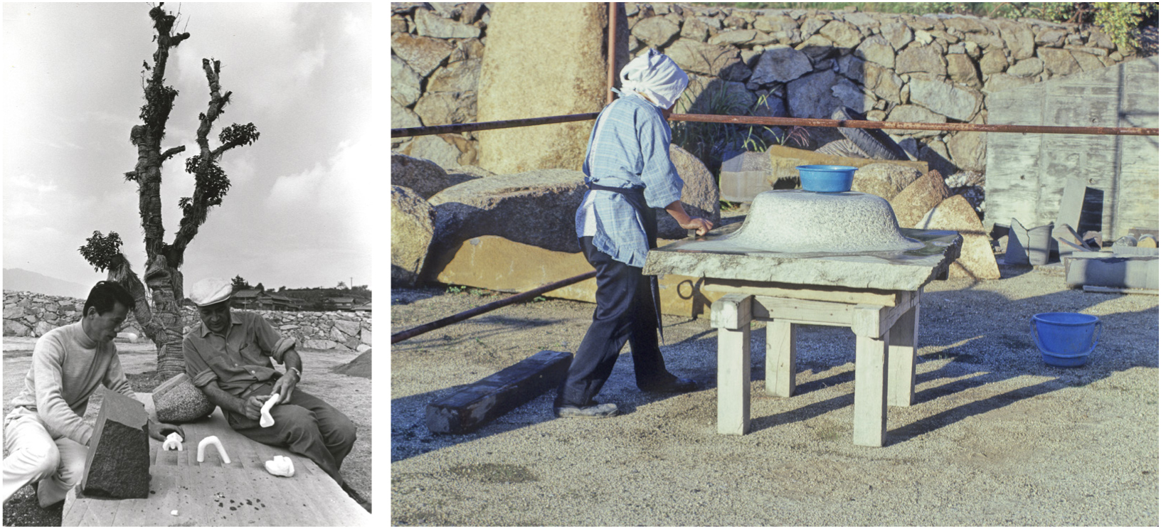 His base for these experimentations was Mure, located on the island of Shikoku in Japan, a stone-producing region rich in raw materials. In 1969, Noguchi established a studio there (fig. 15). This move to Mure would mark the first time he worked with other sculptors, including the young and brilliant Masatoshi Izumi, who belonged to a family of stonecutters and had opened a stone studio (fig. 16, left). Izumi recalled that “[Noguchi] was seeking to make heavy stones look light, hard stones look soft, [and] immobile stones like they were in motion.”61 Izumi also knew local stonecutters who could be employed in the demanding process of polishing and finishing his sculptures (fig. 16, right).