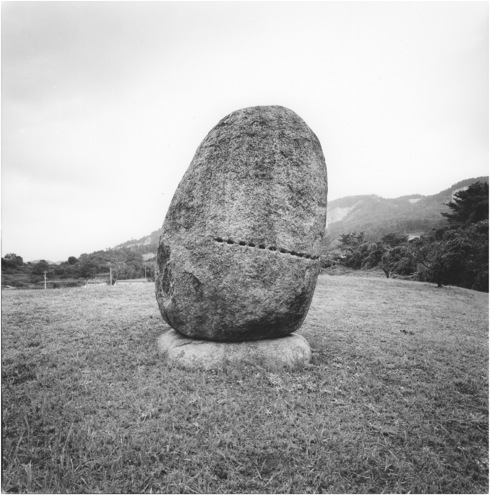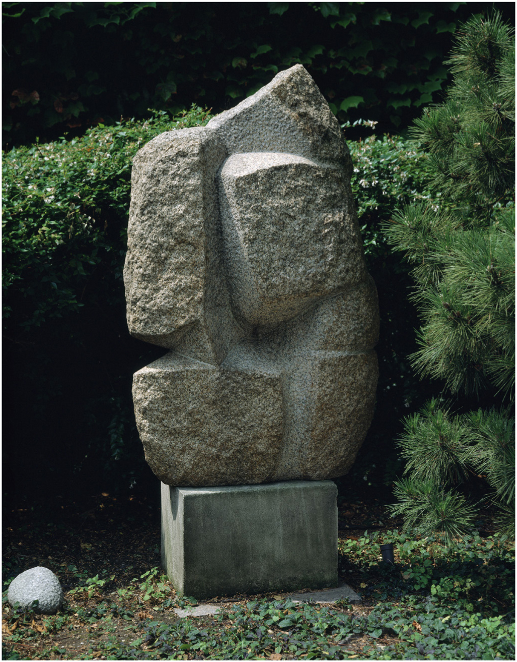 A few years before his death, Noguchi admired a monumental oval boulder of pink mannari granite poised on the summit of a hill behind his Mure studio (fig. 19). He asked Izumi to bury his ashes in a cavity in the stone after his death, drawing a line with red bengara to indicate where and how it should be carved. Although this marking had faded by the time Noguchi died three years later, Izumi carved a hollow chamber between the boulder’s horizontal halves and placed his mentor’s ashes in it. Hart has said that “his pieces are like time capsules, each encapsulating what he could and could not control: natural formations (stone formations, weathering), industrial formations (quarrying, stone splitting, measuring), and artistic formations (carving, polishing).”97