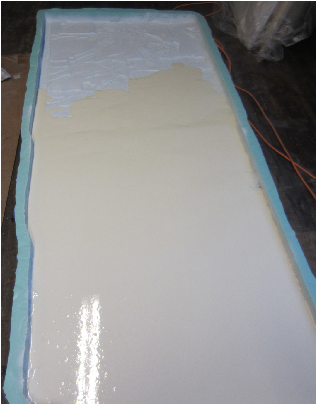 Adam J. Aja: The recasting was one of the options for students and took place over several semesters (other elements included the preparation of gallery materials etc.). I worked with them to remove the casts from storage, to clean them, and to fill holes and cracks. We would then complete a cosmetic restoration of the pieces. If casts were in multiple fragments, we would reunite them and fill the seams just at the surface (figs. 5, 6). If we had two parts of one scene that could be reunited, we would fill the gaps between them. We made new molds and poured a lighter- weight urethane resin into those molds (fig. 7). The new resin casts, which were essentially plastic, could easily be hung on the wall. Later, I worked on painting and coloring the casts to look like ancient stone.