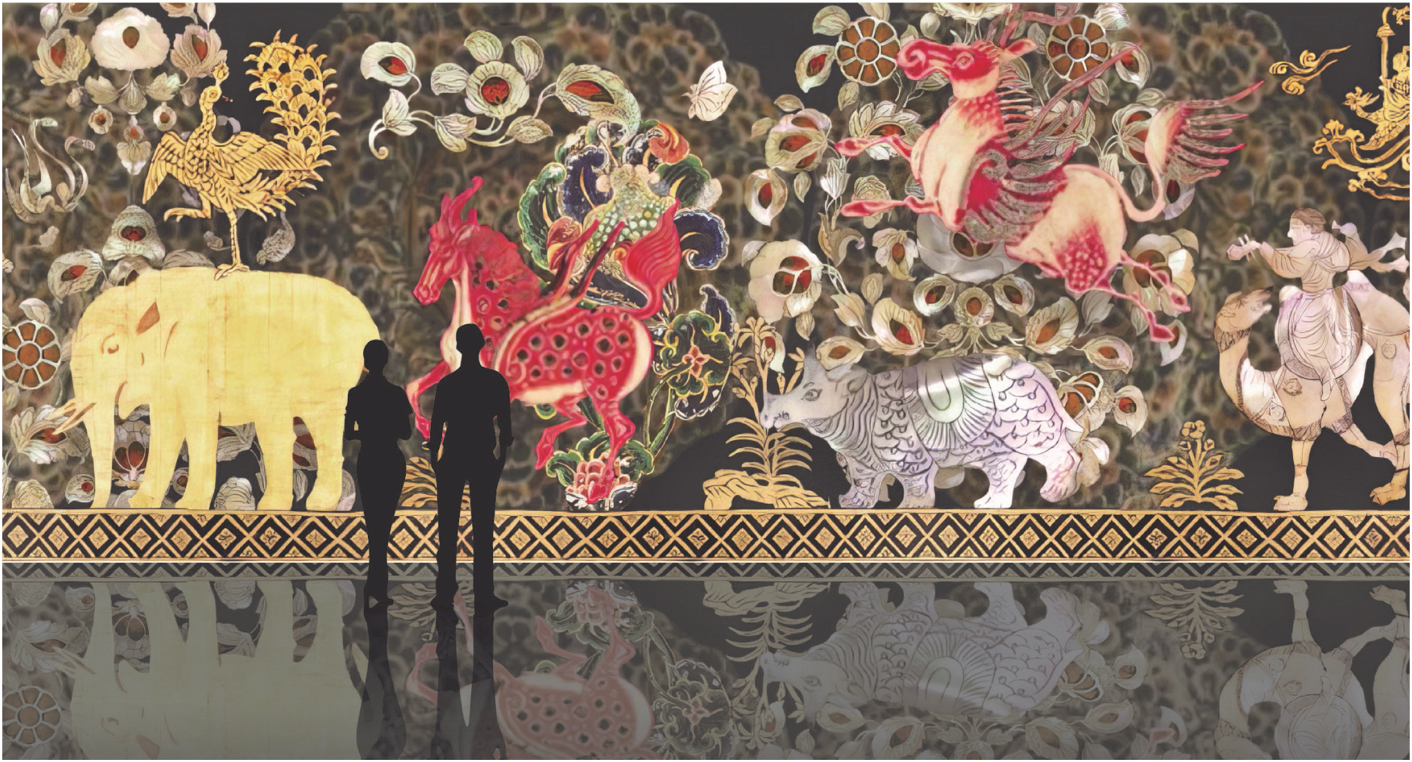 Built in the eighth century as the repository of the Tōdaiji temple in Nara, the Shōsōin preserves around 9,000 objects and 10,000 documents, including manuscripts, textiles, ceramics, lacquer, and metalwork, many of which came to Japan along the Silk Road from China, Southeast Asia, Iran, and the Middle East. As opening the Shōsōin requires the emperor’s permission, only a handful of privileged individuals have had access to its contents through much of the repository’s history. Since the 1870s, under the auspices of the government, artists and researchers have made physical replicas of the treasures by painstakingly re-creating their original materials and methods of production. More recently, the Office of the Shōsōin has worked with the Japanese printing company Toppan to produce high-fidelity printed and digital reproductions. The current exhibition Shōsōin THE SHOW contains only replicas, both physical and digital.