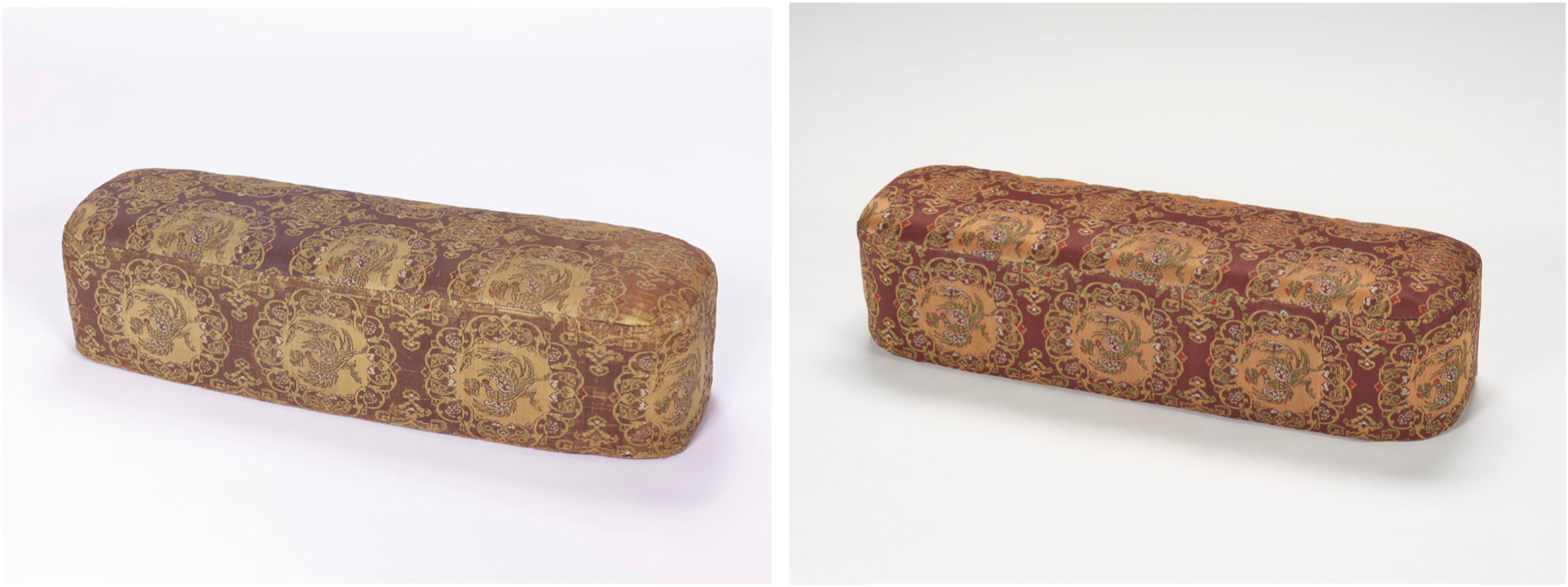Last year, the annual Shōsōin exhibition showed the original of a treasure called the Armrest of Nishiki with Phoenix Design on Purple Ground (Murasaki-ji ōtori-gata nishiki no on-shoku) together with the physical replica and the digital replication (fig. 6). I was comparing it to what happened with the Hōryūji Triad, where the Tokyo University of the Arts Center of Innovation (COI), with support from the Ministry of Education, Culture, Sports, Science, and Technology, and Hōryūji, created three physical “replicas” (fig. 7). One, a kurōn bunkazai or “clone cultural property,” which replicates how the sculpture looks today, in minute detail. A second, a “super-clone cultural property,” approximates what the sculpture was like when it was originally made. The third, a “hyper-cultural property,” is quite experimental—a triad mainly in glass to show that the body of the Buddha is made of light. Of course, artisans didn’t have that sort of glass technology in the seventh century, but the idea is that if they did, they might have used it to capture the Buddhist teaching about the Buddha’s body more effectively than gold gilding. This replica is a more creative, future-looking interpretation. I realize that for the 1972 Shōsōin project, they could not have made the kurōn bunkazai, because, as we can see in the case of the Hōryūji Triad, to re-create how a historical object presently appears, one would have to add both the patina and the damage. The creators of the “cloned” triad used bronze and the lost-wax technique just like the original statue, but they had to intentionally make it look old. If you were to create onaji mono o mō hitotsu of an eighth-century Shōsōin treasure as it remains today, then you would have to spend thirteen centuries making it because artificially applying the passage of time (as makers did for the “cloned” triad) and calling it onaji mono (the “same thing”) would be a lie. For the Shōsōin’s idea of saigen mozō, they cannot physically reproduce how it looks today, but a digital replica can provide that aspect.