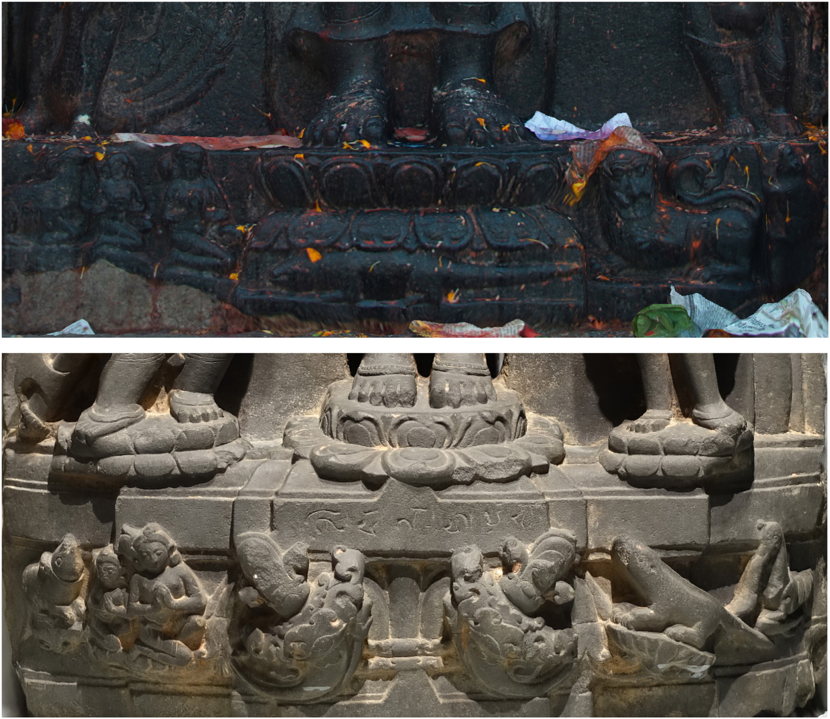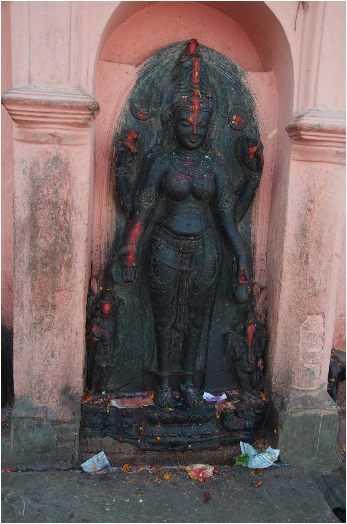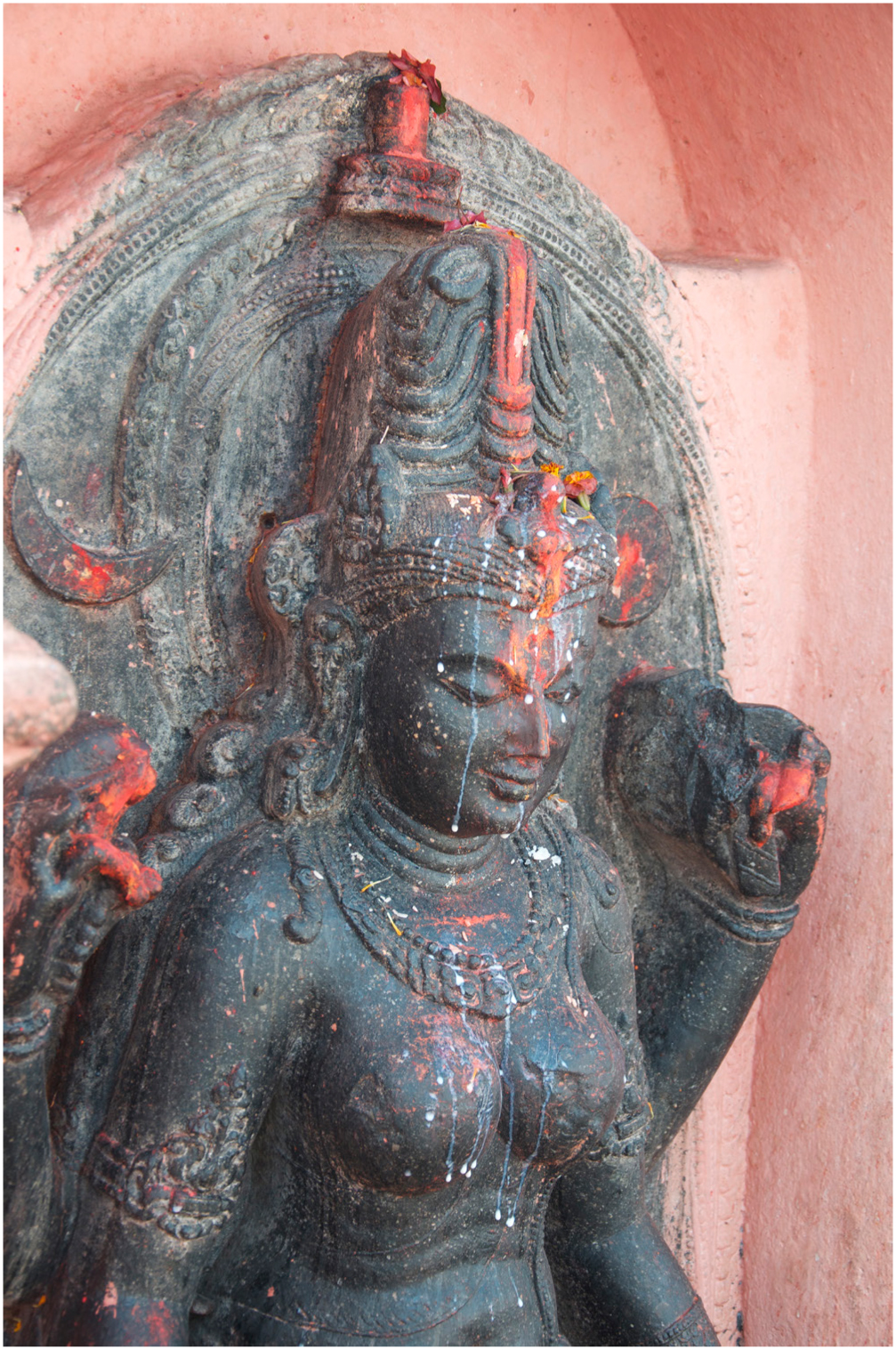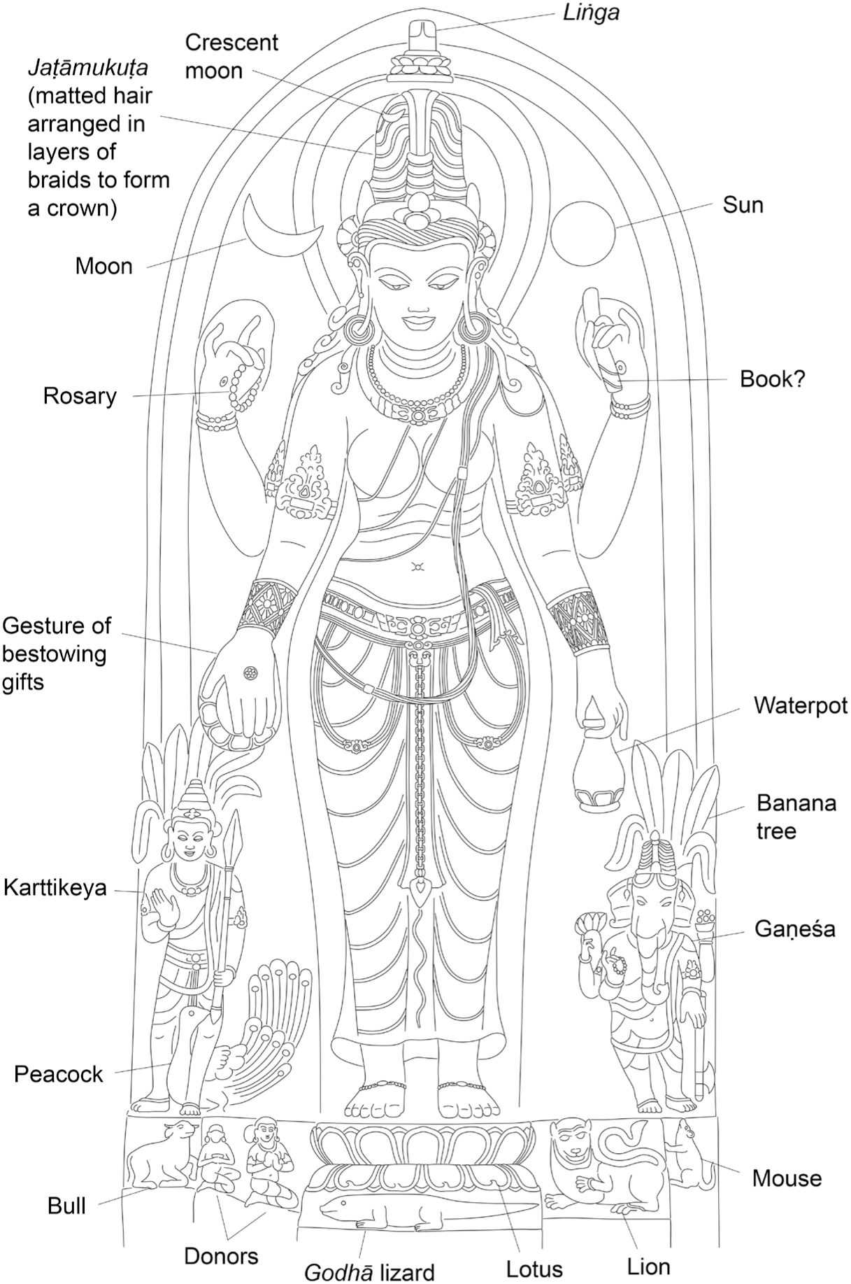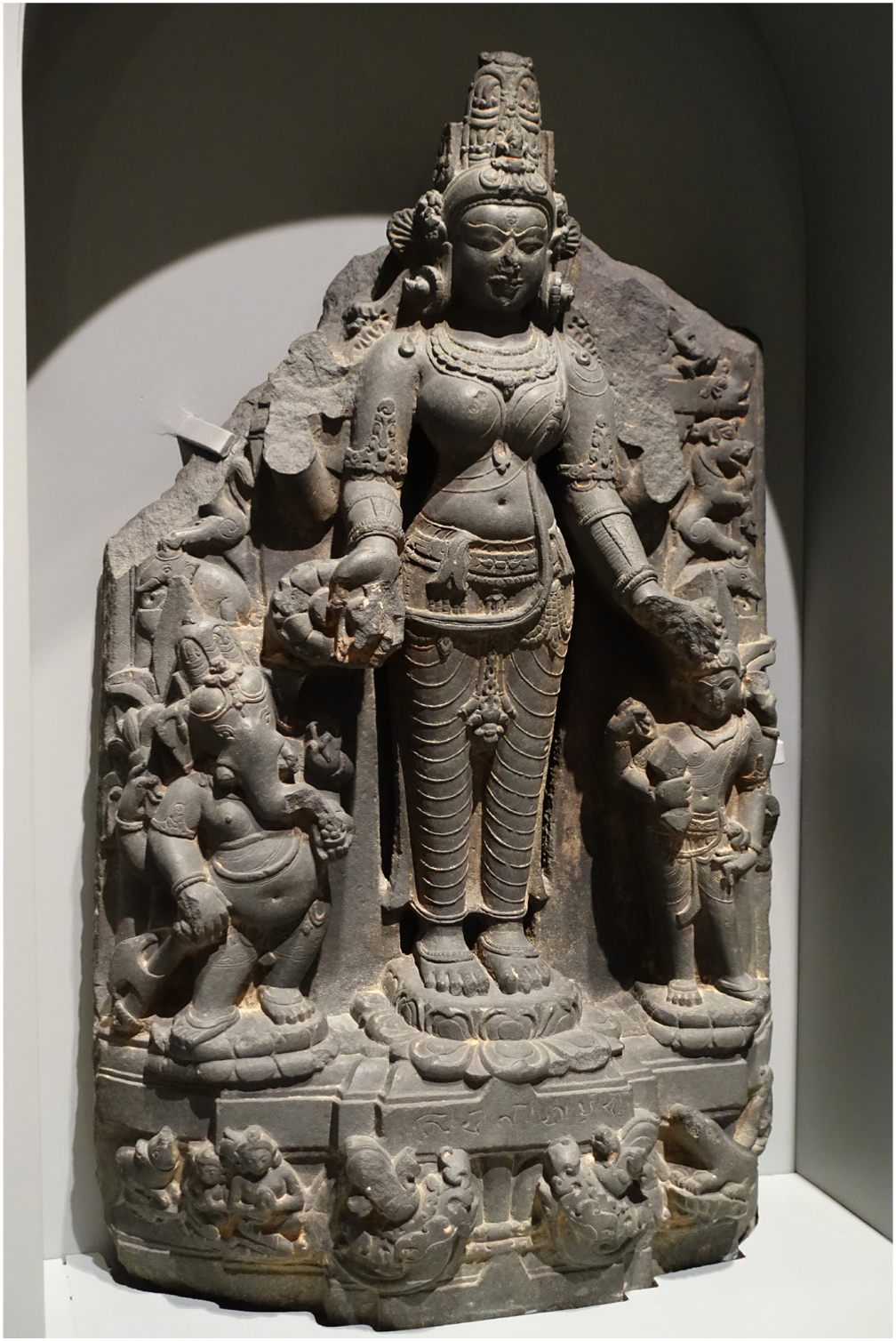 The common practice of the art historian is to first identify the iconographical components of the image, from clothing to attributes and hand gestures. The Pārvatī stele is placed inside a niche to the left of the entrance temple. The four-armed goddess is standing on a lotus. Her hairstyle resembles the jaṭāmukuṭa (matted hair arranged in layers of braids to form a crown) of her husband Śiva. Their relationship is also testified by the crescent moon, Śiva’s emblem, attached to the crest of her hair. A liṅga, Śiva’s phallic symbol, hovers above while the sun and the moon flank the head of the goddess. Pārvatī’s facial expression is calm and the eyes are directed downward. Her right hands hold a rosary and make the gesture of bestowing gifts, and her left hands hold a waterpot and what appears to be a book.4