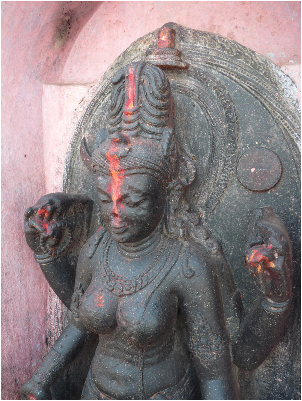 The 3D model presented here shows the stele of Bargaon Pārvatī under veneration. It is decorated with flowers and red paste, bathed with milk, and “nourished” with rice. Despite the faithful capture of the state of worship, the virtual image presents the results of the ritual but not the ritual itself.