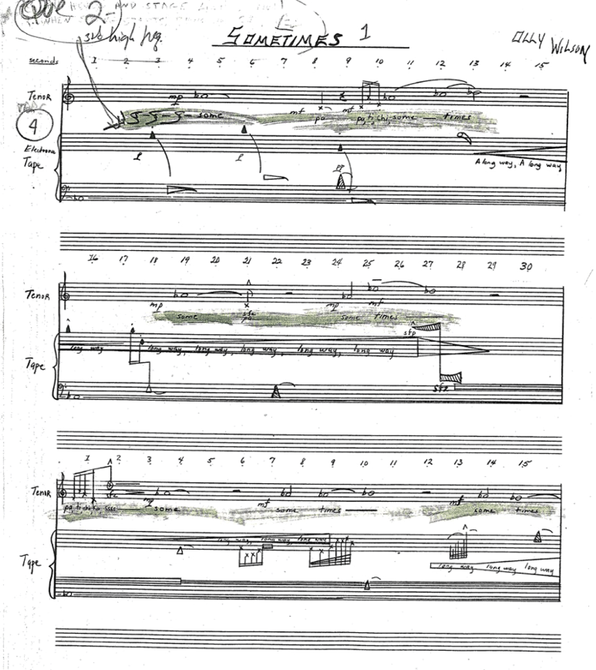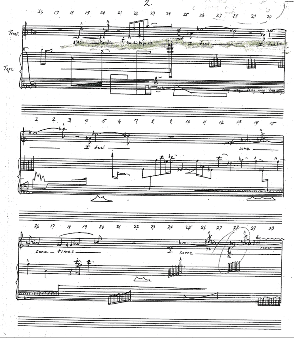 The score is notated on three traditional staves, one for the tenor soloist and two for the prerecorded tape parts and the prerecorded vocal part. The score combines graphic notation with abstract symbols and shapes with traditional pitch-specific notation. The performance is coordinated by a timeline grid at the top of each page. There are written text cues in the score to assist in the coordination of the parts.