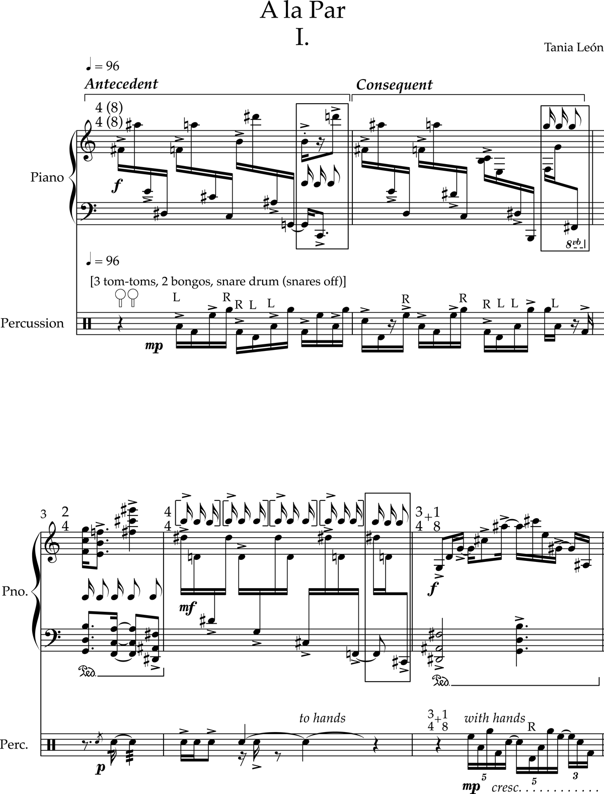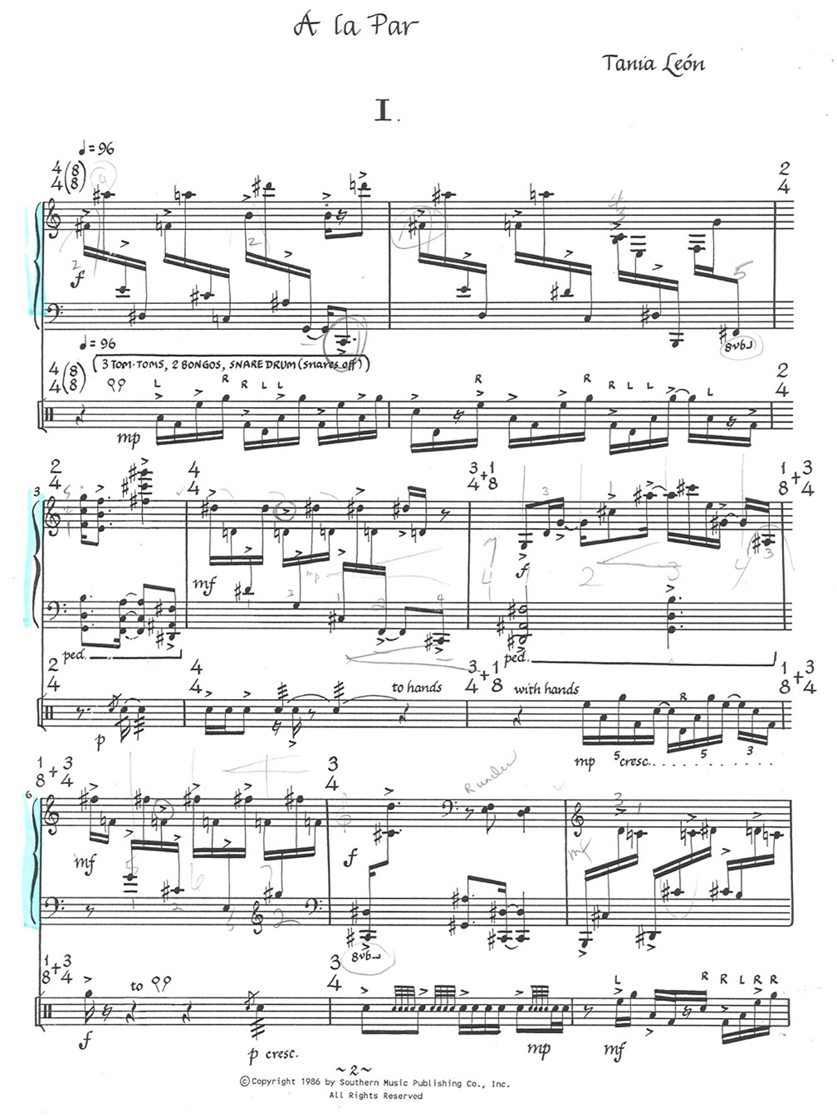The second example is a short excerpt from the first movement of Tania León’s A la Par for piano and percussion (audio file and first page of score in Figure 2; partial score in Appendix 2), which was written in 1986. Tania León (born 1943) is a native of Havana, Cuba. She is a composer, conductor, educator, and arts advocate. Her compositions include works for orchestra, band, chamber ensembles, voice, and solo piano. Her orchestral work, Stride, was awarded the 2021 Pulitzer Prize. As you consider this piece, think about the intersections of race, culture, and identity that have been raised throughout this essay. Leon’s life and career embodies some of the complications we can anticipate in considering a theory of African American music. I had the opportunity to write the liner notes for a recording of A la Par some years ago and reprise my brief description here as an introduction:
