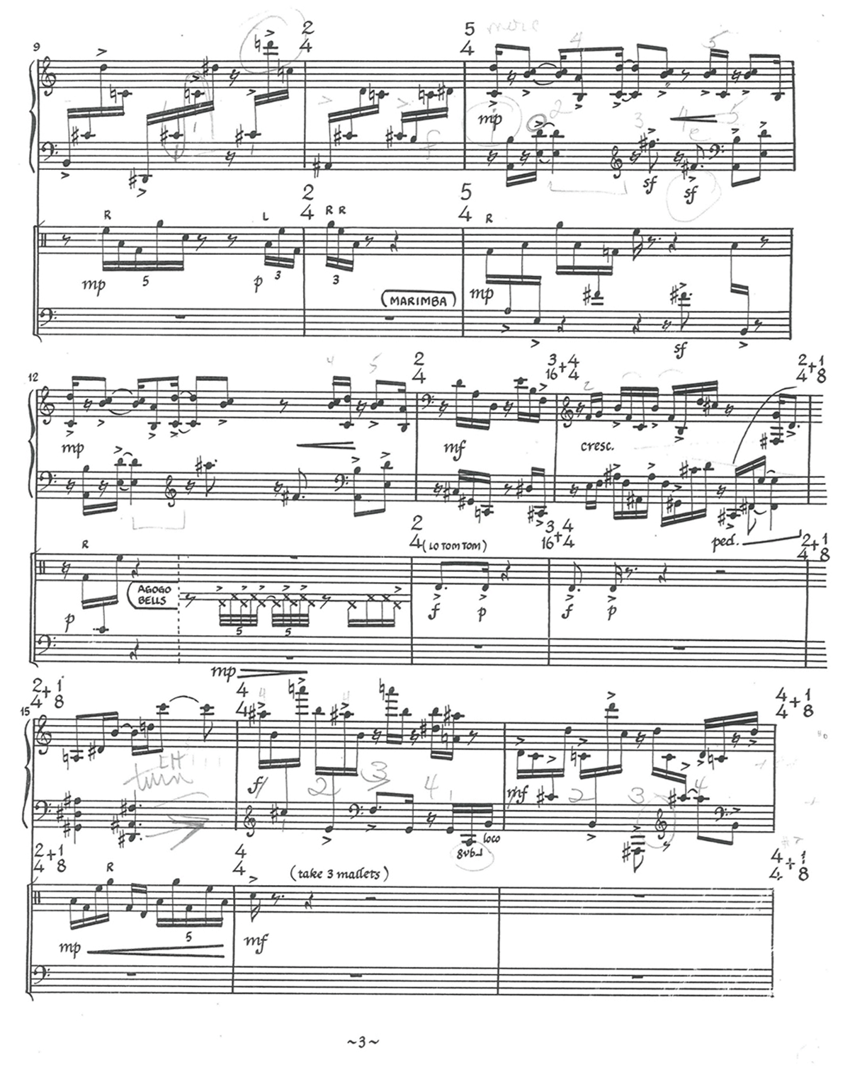 This A la Par excerpt provides an opportunity to amplify the observations above. This work can be considered and analyzed from several different vantage points, cultural, musicological, and theoretical. First, Afro-Cuban and African references abound. The instrumentation for the percussion part includes standard orchestral instruments as well as instruments associated with Afro-Cuban music such as bongos, agogo bells, cowbell, maracas, glass bottles, timbales, claves, conga, and cachiche. Cuban dance rhythms such as the habanera are also alluded to throughout the movement and the entire piece. And yet these traditional Afro-Cuban instrumental sounds and rhythmic references exist here in a decidedly modern, post-tonal context.