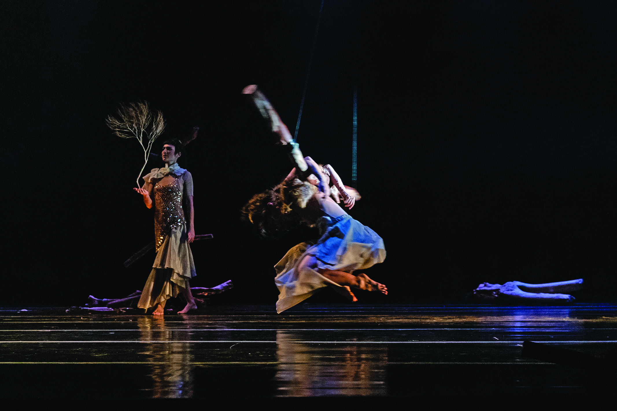 The idea of simpoesis and the proposal to fabricate multispecies plots unfold into two dimensions in Viver com, morrer com: one more related to the treatment of materials and corporealities, and the other to dramaturgical construction. Regarding the former, the creative process is marked by a desire to give the corporeality of the materials themselves (tree trunks and branches from pruning) protagonism, betting on their capacity for agency and for creating meaning and subjectivities. It is worth mentioning that one of the group’s members, Andrea Barbour, in addition to being a circus artist, is a visual artist; hence, discussion about materialities is very present in the group. From the outset, we have explored working with trunks and branches not merely as scenery or as “circus apparatus”—options that place them in a hierarchically inferior position in terms of the potential for agency. The protagonism of these materialities is a guiding principle throughout the work, unfolding in choices regarding lighting, temporalities/rituals (in some moments, the larger trunks remain alone on stage for a time as principal agents) and in interplay with projected documentary images. For example, there is a moment when a projection shows a pruned tree being hoisted onto a truck and shortly after a trunk is raised on stage, creating, without the presence of a human figure, a continuity of meaning and the suggestion that this may be the same tree. Alternatively, in scenographic proposals—such as having some larger and denser trunks suspended on stage, hanging by a very thin, high-strength rope—the impression is that these trunks move on their own and float on stage; this is also our way of re-enchanting them. At times, we also play with the relationships of continuity between the trunks and our bodies, constructing a visual illusion of reconstructing the tree, which is our way of invoking a phantom tree.