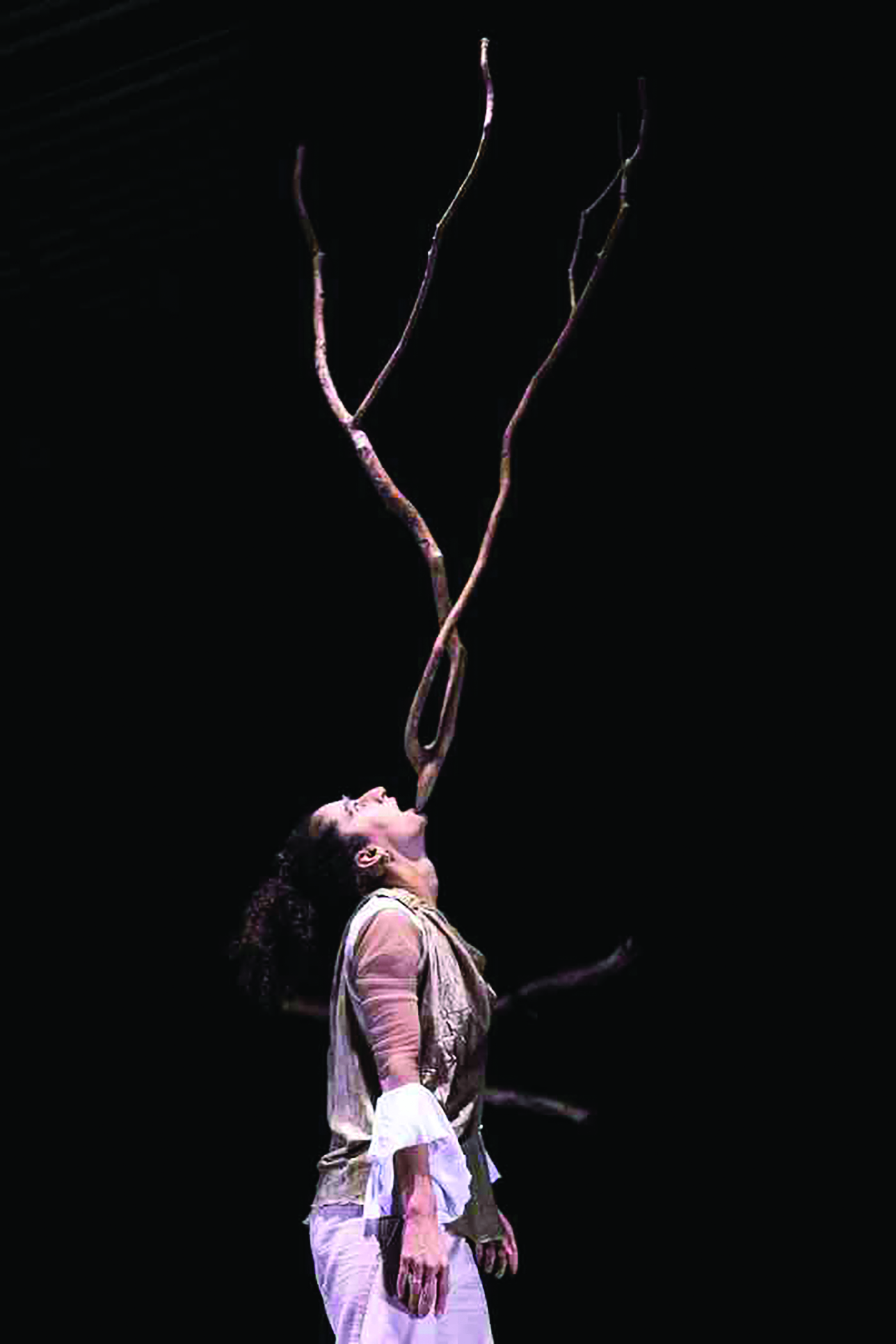 The circus corporealities in the work follow the same principle of not overshadowing the agency of these scene partners—which means refraining from treating them as mere apparatuses via which we display our technique and mastery. During the improvisational practices that gave rise to the movement scripts (which are also considerably open for variation), investigative proposals were related, for example, to exploring the physical qualities of these partners (weights, shapes, textures), how they can move us and suggest movement (rather than merely “how we can move them”), the supports they offer us and what we might offer in return. The choreographies, in this sense, hardly involve codified movements already recognized as circus tricks—even though my over twenty-year experience practicing fixed trapeze, for example, certainly helps me move on a horizontally suspended trunk and suggests some movement repertoire (as can be seen in Figure 1 above). Nor do we prioritize movements whose artistic effectiveness lies in demonstrating dexterity: although we do invoke risk in various movements—for example, by balancing a large branch on the chin (see Figure 4) or standing on a moving suspended branch—we forgo the gestures and rhythms that traditionally contribute to a demonstration of prowess, conventions such as slowing down in preparation for a major trick to generate suspense or executing long pauses in more challenging positions. Allowing space for the scene’s subjectivity to develop from the agency of the trunks and branches operates metaphorically to distance us from the modern narrative of nature as a resource to be managed.