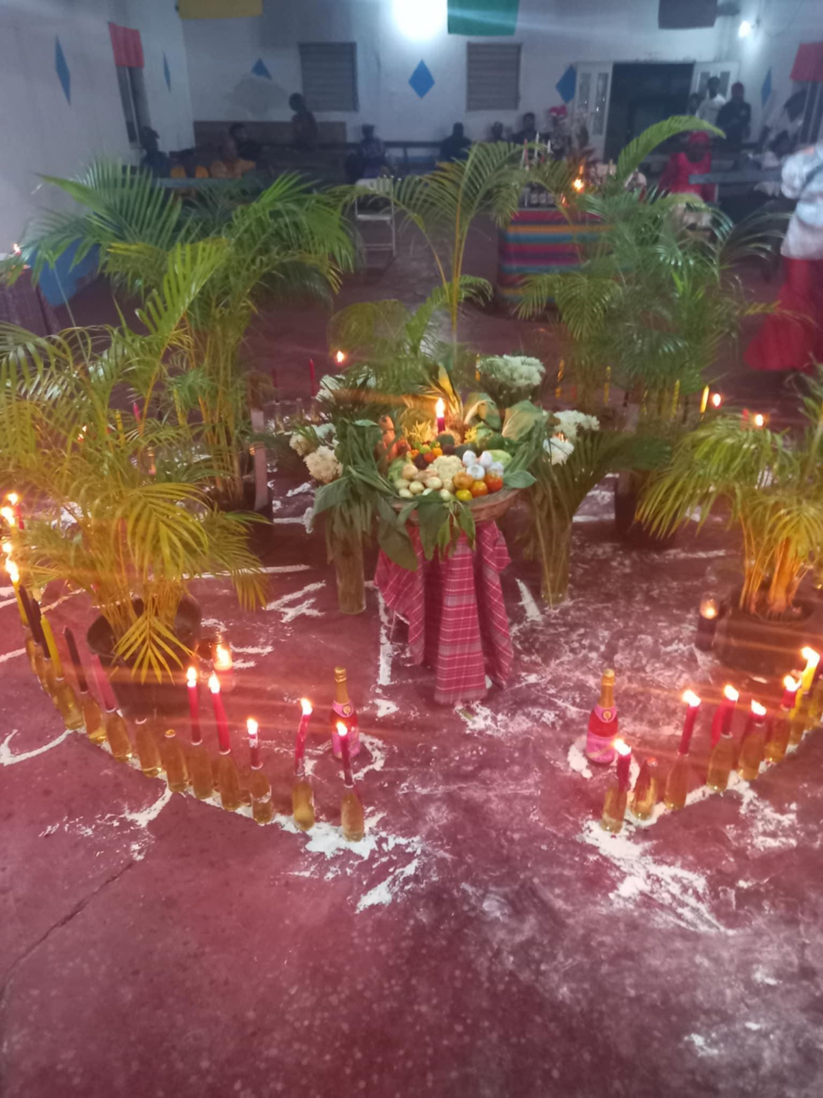 The church’s entrance was marked by a “seal”—a ritual object consisting of water, a bottle holding a candle, and specific instructions to walk around it three times counterclockwise. This ritual parallels practices in other Afro-Caribbean and African traditions, such as the Yoruba custom of encircling sacred spaces to invoke protection or spiritual alignment. These shared elements highlight the continuity of cultural practices across the African diaspora, emphasizing a deep-rooted connection to ancestral traditions and their symbolic significance. Upon entering the church, the vibrant and symbolic decor heightened my anticipation. The healing pool at the center of the space, adorned with representations of mermaids (mother, father, and children), combs, brushes, perfumes, and a bell, immediately stood out. Olive Lewin’s Rock It Come Over: The Folk Music of Jamaica (2000) emphasizes the significance of water as a purifying and healing force in Afro-Jamaican traditions. The pool’s central placement underscored its importance as a site of spiritual transformation. Adjacent elements, such as machetes for “clearing” evil spirits and seven candles symbolizing divine completeness, further enriched the space’s layered symbolism. Sylvia Wynter’s We Must Learn to Sit Down Together and Talk About a Little Culture (2022) offers a critical framework for understanding Revivalism’s performative and spiritual dimensions. Wynter highlights the cultural significance of ritual as a means of negotiating identity and history.11 This perspective resonated as I observed the interplay of colors within the church. Colors had specific symbolisms; red signified the blood of Christ, gold represented holiness and divine power. The inclusion of the “bandana,” or madras, hinted at Indian influences, underscoring Revivalism’s creolized nature.
