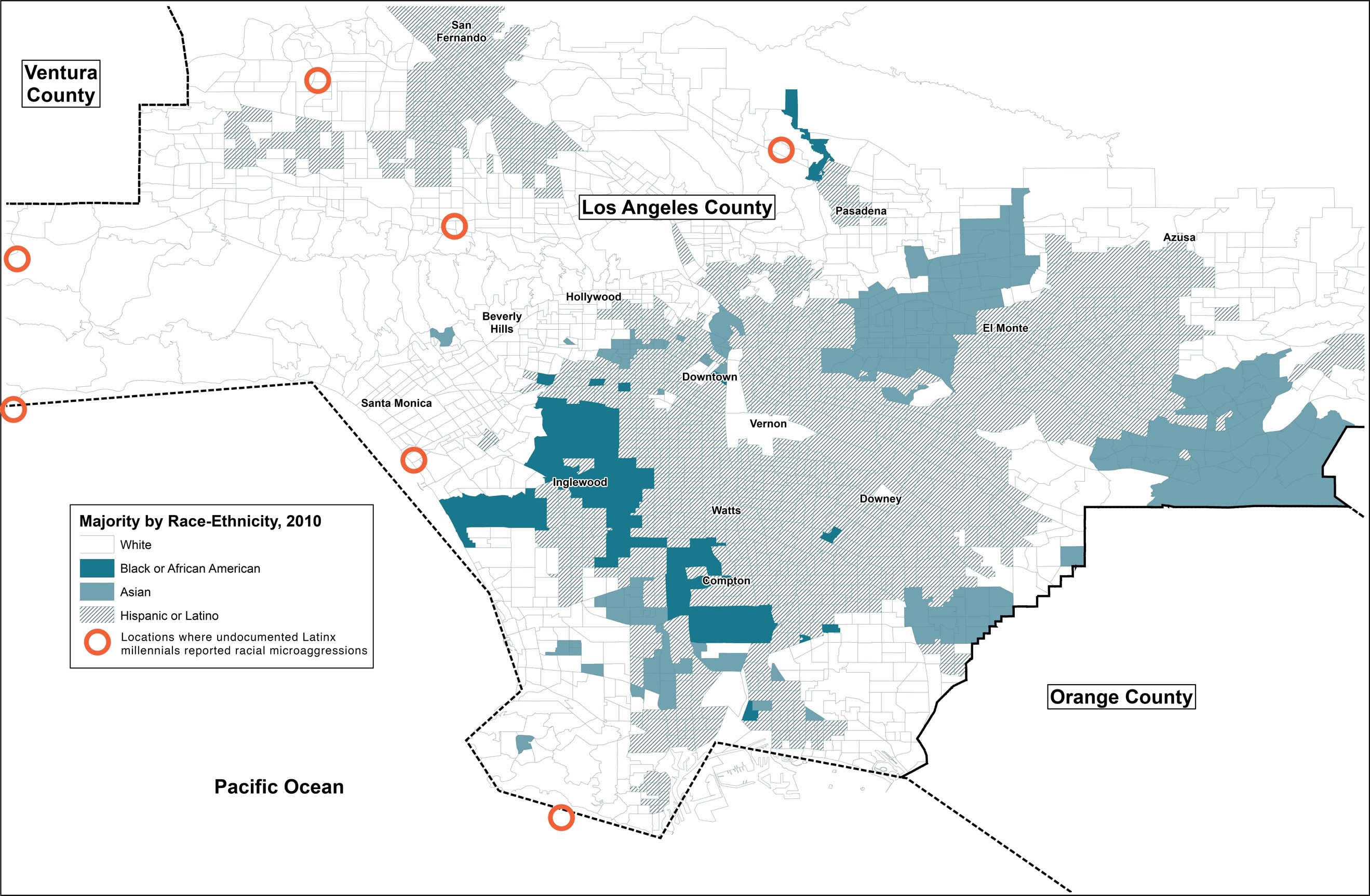Many undocumented Latinx millennials in my study had come of age in largely Latinx, immigrant-friendly, homogenous communities. It is in these neighborhoods that young adults reported that they rarely felt like racial or immigrant outsiders. I came to learn that young adults saw predominantly White neighborhoods and public spaces as places where they do not belong, and they felt this way based on their experiences of racial microaggressions in these spaces. Undocumented Latinx millennials experienced racial microaggressions spatially as they moved through Los Angeles and found themselves in predominantly White neighborhoods and public settings, such as restaurants, malls, and retail stores (see Figure 1).
