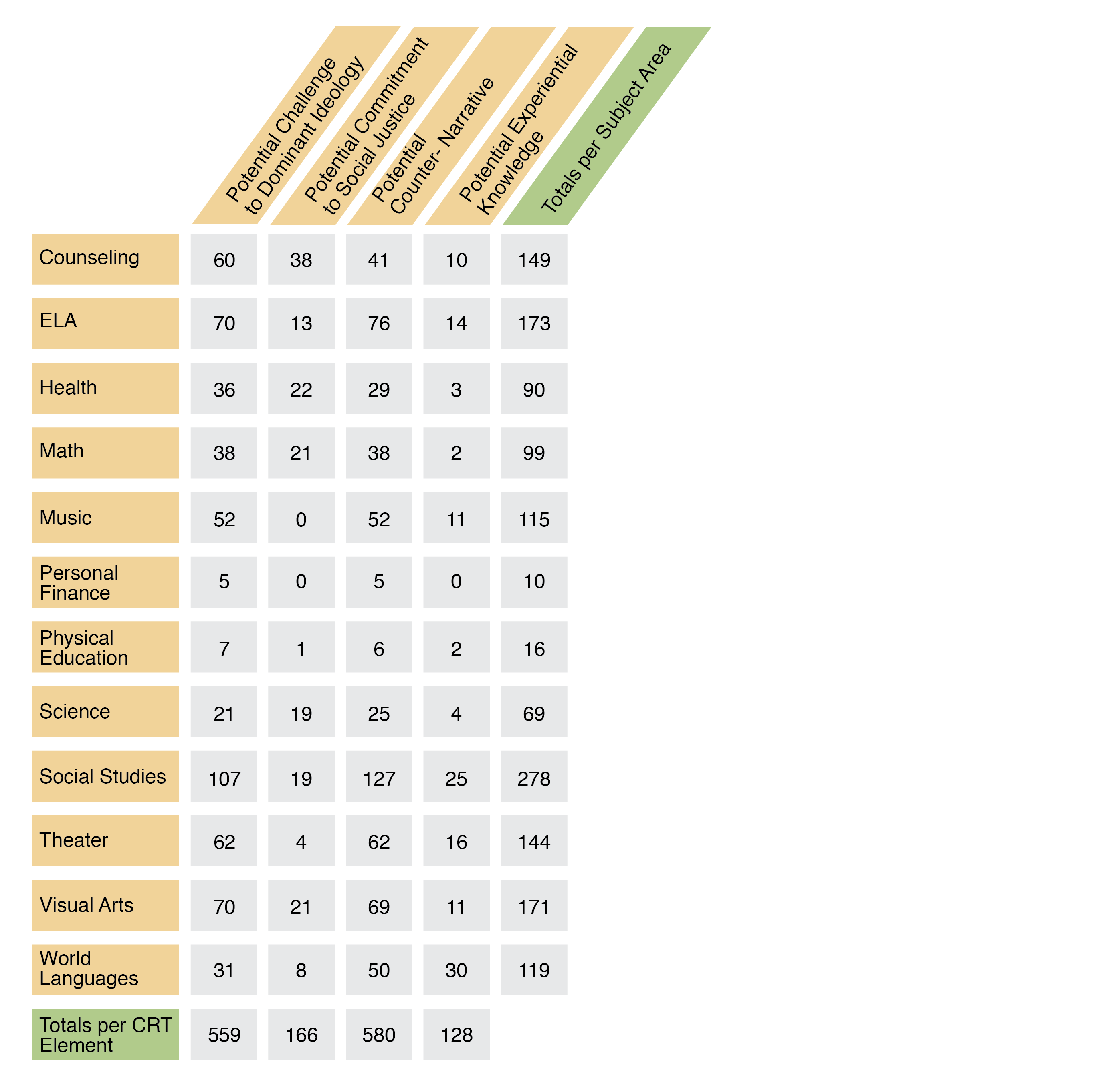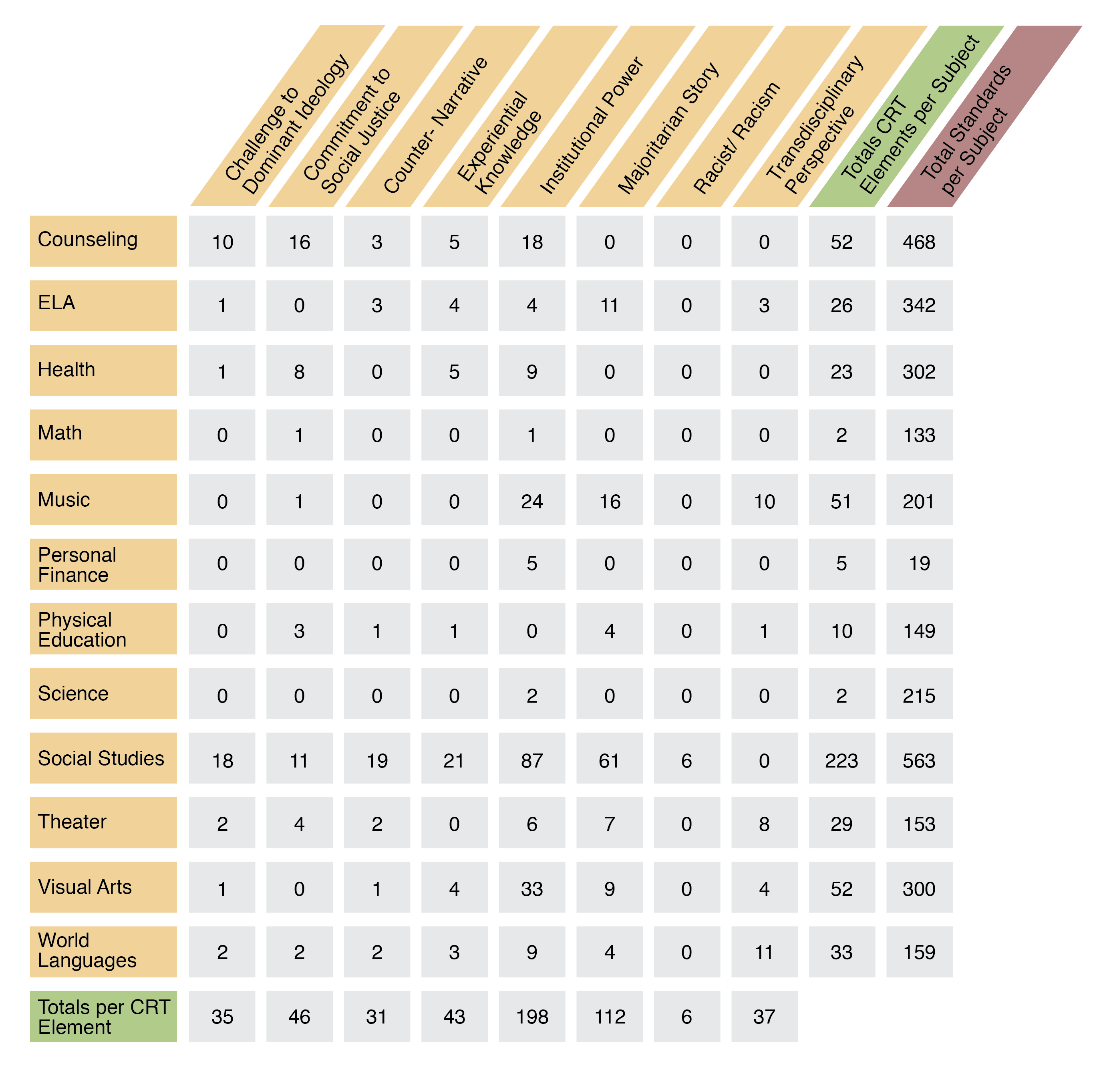 Social studies had the highest number of standards with CRT elements of racism, majoritarian stories, and institutional power, followed by visual arts and music. Considering social studies deals largely with American history and government, which is fraught with racism and institutional power, it is logical that its standards would have the highest amount of those three elements. One example of this in Missouri, United States and World History 3aF, includes, “Analyze the cultural interactions among these groups: a. Native Americans, b. immigrants from Europe, c. Africans brought to America.” This standard is racist because it euphemizes “slaves” or “enslaved peoples” with “Africans brought to America.” This euphemization softens the realities of the slave trade.