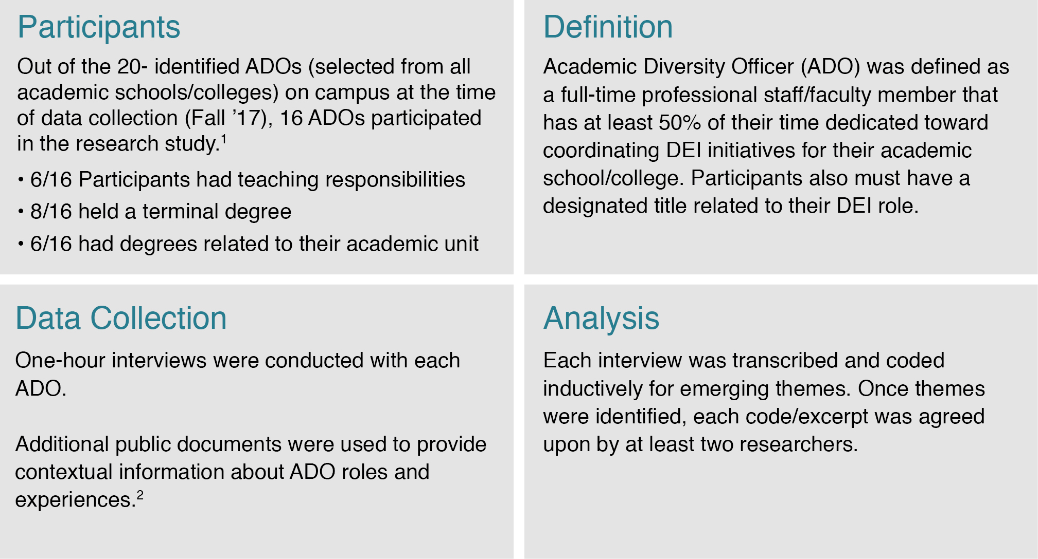 In 2015, the University of Michigan embarked on an institution-wide five-year diversity strategic planning process. Along with centralized goals for increasing DEI, 51 DEI plans were developed by academic and administrative units. Coordination of the planning and implementation process was led by unit-level staff and faculty. As a direct result of the university’s DEI charge and strategic planning process, many academic units at the university created their own diversity officer positions to lead, coordinate, support, execute, and create structures of accountability for their units’ DEI strategic plans. We refer to these academic-unit level positions as academic diversity officers (ADOs).