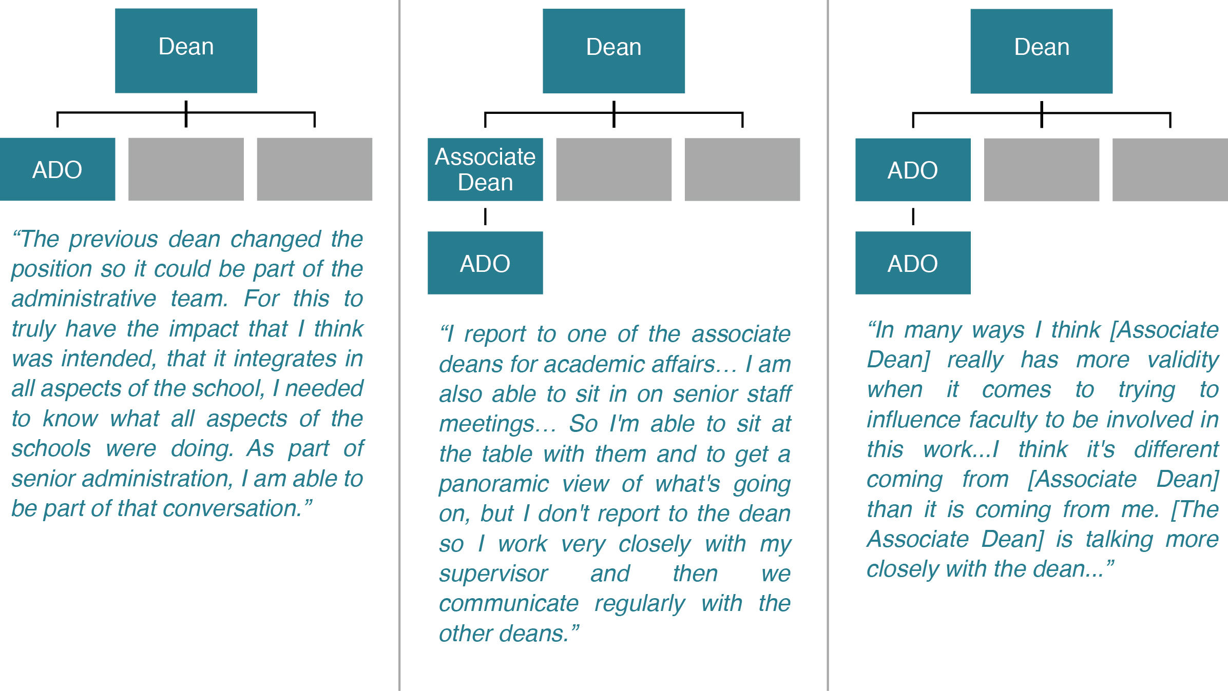 Although each of the ADO roles are unique within their academic context, there were some organizational similarities. ADOs are supervised by either the academic dean (Figure 1a) or associate dean in each unit (Figure 1b). There are also split supervisory arrangements in which deans and associate deans share supervision of ADOs regarding different aspects of their role. Another theme that emerged from organizational structure analysis was the responsibilities between faculty and staff initiatives. Three out of the 16 units represented had separate ADOs for faculty initiatives and staff initiatives (Figure 1c).