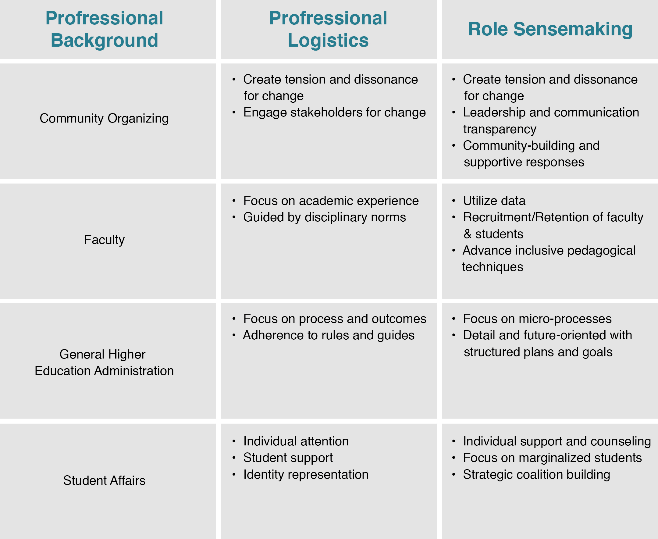 There is no linear nor set path to diversity work roles. The ADOs at the University of Michigan have a diverse set of skills based on a myriad of previous professional experiences. We noticed that there were four main categories of professional experiences ADOs had held previously to their current role: faculty, student affairs, general administration, and community organizing. All of these roles provided unique skills that were directly and indirectly related to DEI work. What became clearer through further analysis is that previous professional roles provided frameworks, schemas, and logics that were used to make sense of the often-ambiguous ADO roles. The following is an analysis of how professional logics from previous positions shaped the sensemaking processes of ADOs.