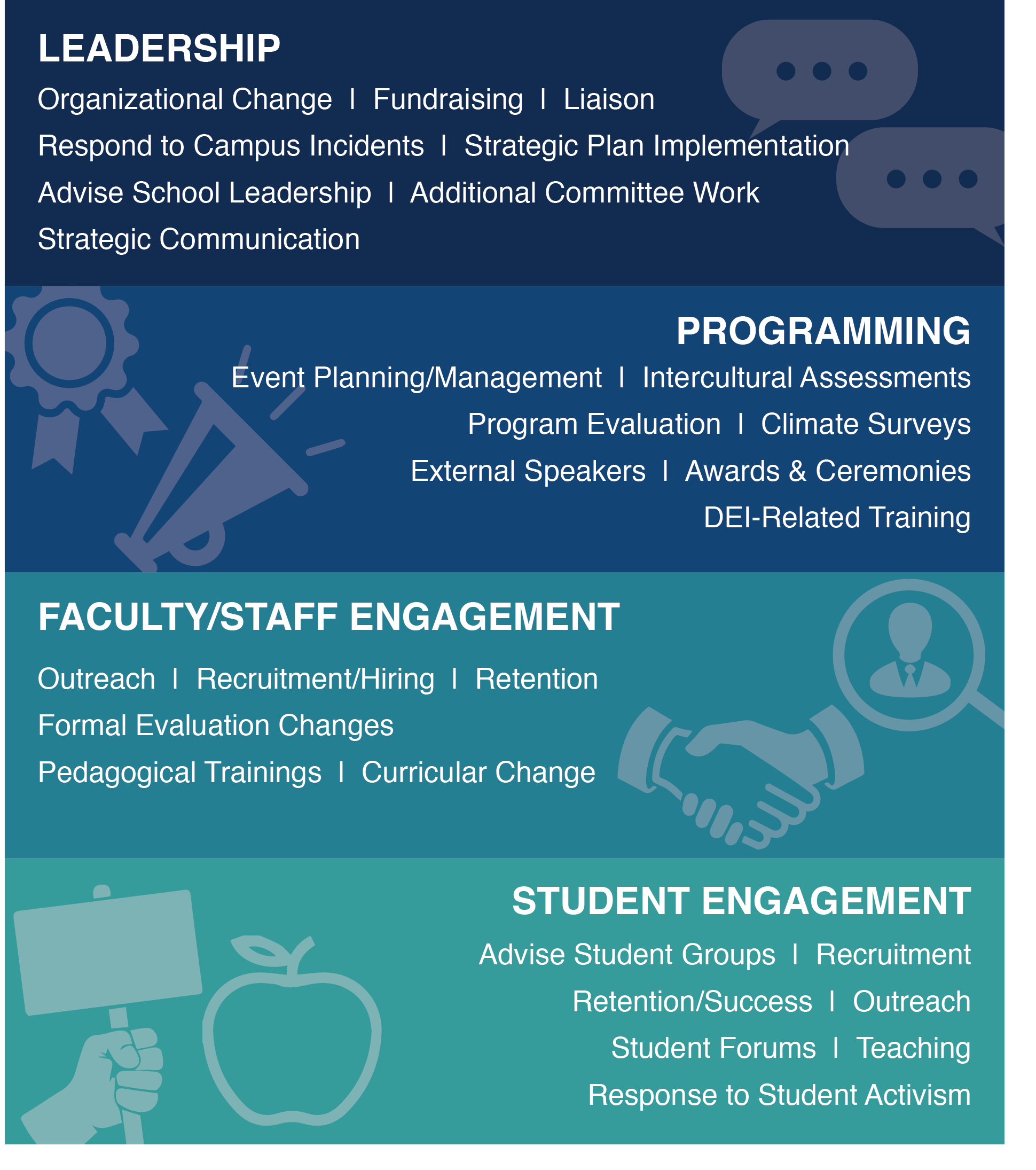 A few ADOs had previous roles directly supporting students. The student affairs ADOs spent a significant amount of time doing student outreach, especially to student groups from historically marginalized backgrounds. They valued representation and ensured not only intentional outreach to student communities and individual students but also increased diversity representation in already formed student groups/committees/advisory boards. These ADOs made a special effort to and prioritized time for student one-on-one meetings and town halls after local or national DEI incidents. The personal connection and processing were an important part of building and sustaining inclusive communities. Because of the allocated time to managing crisis responses and conducting one-on-one meetings with students, student affairs ADOs often felt like they did not have enough time to perform other tasks, such as reporting, writing, or strategic thinking.