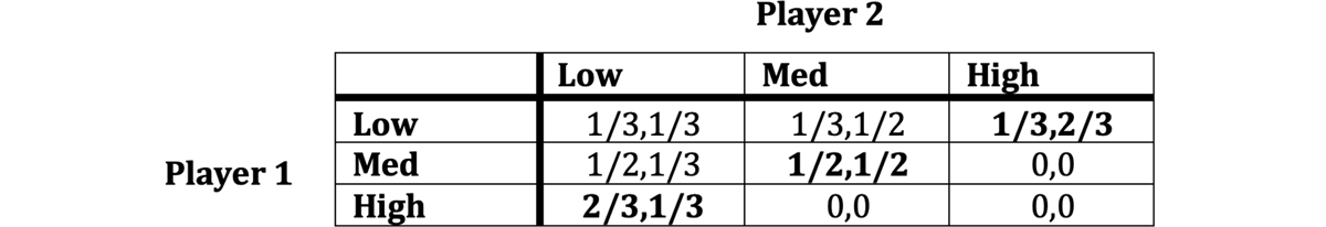 The three Nash equilibria are bolded. As in the more complex game, the equilibria are the strategy pairings where the resource is perfectly divided. These will also, generally, track the stable outcomes that will emerge between groups in our models. In other words, when we culturally evolve groups playing this game with each other, they will tend to end up at one of three states. Either 1) group A demands high, and group B low, or 2) both groups demand medium, or 3) group A demands low and group B high. Within each group, fair behavior will tend to emerge since in-groups act like unitary populations.13 Thus despite its simplicity this game has the representative power to capture a situation where 1) discrimination is not inevitable, that is, there is a fair, non-discriminatory equilibrium, but 2) it is stable, that is, it is the endpoint of many cultural evolutionary models.
