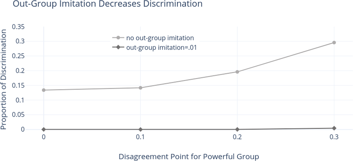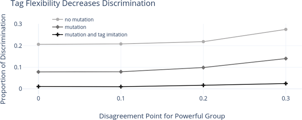 We also consider the possibility that agents can imitate tags from successful group members, as in Popa et al. (2021). That is, if some other group member experiments and adopts an out-group tag, others in their group will copy this strategy if it yields high payoffs. This extra addition lowers the chances that discrimination emerges beyond that from mutation alone (Figure 2). Once agents can experiment and try an out-group tag, imitation allows successful experiments of this sort to spread through the group.18