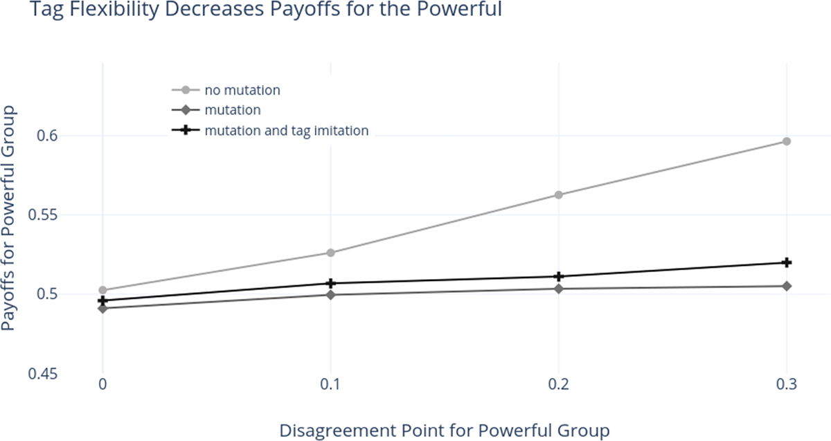 - Notice that in this figure the powerful group does slightly better with mutation and tag imitation than mutation alone. This is true even though tag imitation helps reduce discrimination. The reason is that with mutation only, the models tend to end up in suboptimal states more often, and all players receiver lower payoffs as a result. ⮭